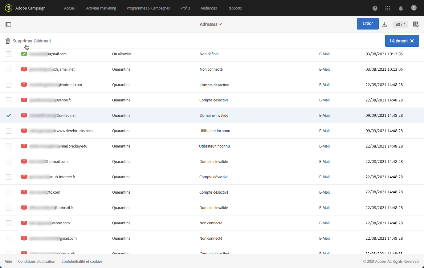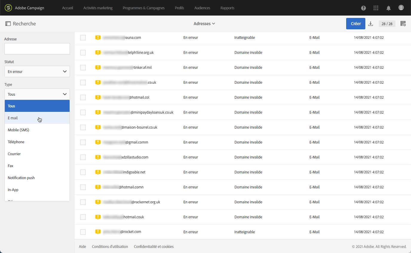 - Les adresses dont le statut est En erreur seront supprimées de la liste de quarantaine après une diffusion réussie.