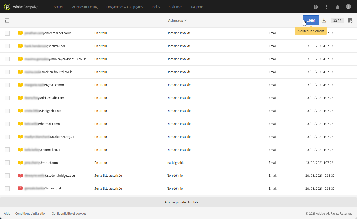 - Les adresses dont le statut est En erreur et qui ont rebondi avec l'erreur Boîte pleine sont supprimées de la liste de quarantaine après 30 jours.
