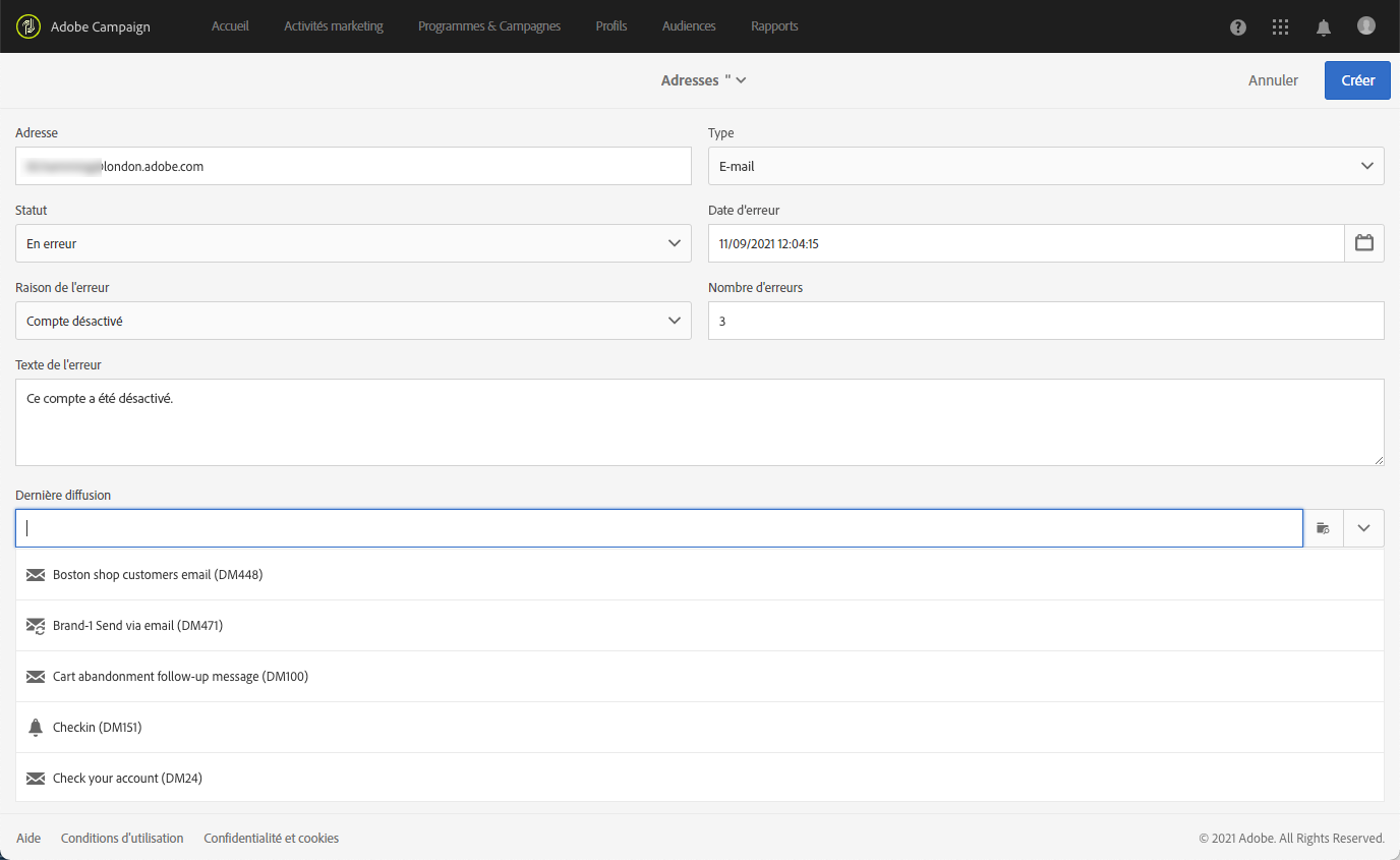 Définissez l’adresse (ou le numéro de téléphone, etc.) et le type de canal. Vous pouvez définir un statut pour figurer dans la liste de quarantaine et un motif d’erreur. Vous avez également la possibilité d’indiquer la date d’erreur, le nombre d’erreurs et de saisir le texte d’erreur. Si nécessaire, sélectionnez la dernière diffusion envoyée à l'adresse dans la liste déroulante.