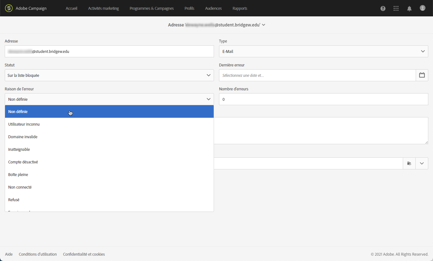 Si un utilisateur qualifie un email comme du spam (système de gestion des plaintes (feedback loop)), le message est automatiquement redirigé vers une boîte email technique gérée par Adobe. L’adresse email de l’utilisateur est alors automatiquement mise en quarantaine avec le statut Sur liste bloquée. Ce statut ne concerne que l’adresse. Le profil n’est pas placé sur liste bloquée afin que l’utilisateur puisse continuer à recevoir des SMS et des notifications push.