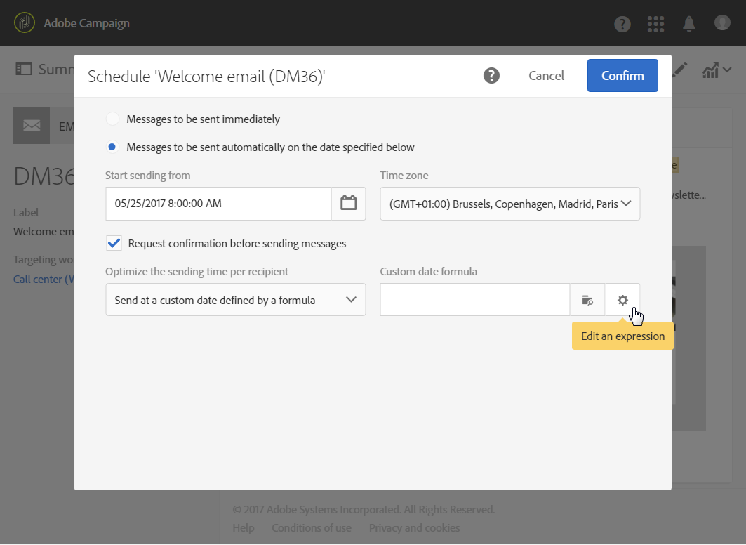 전송 시간 최적화 드롭다운 메뉴에서 Send at a custom date defined by a formula 을 클릭하고 Edit an expression 버튼을 클릭합니다.