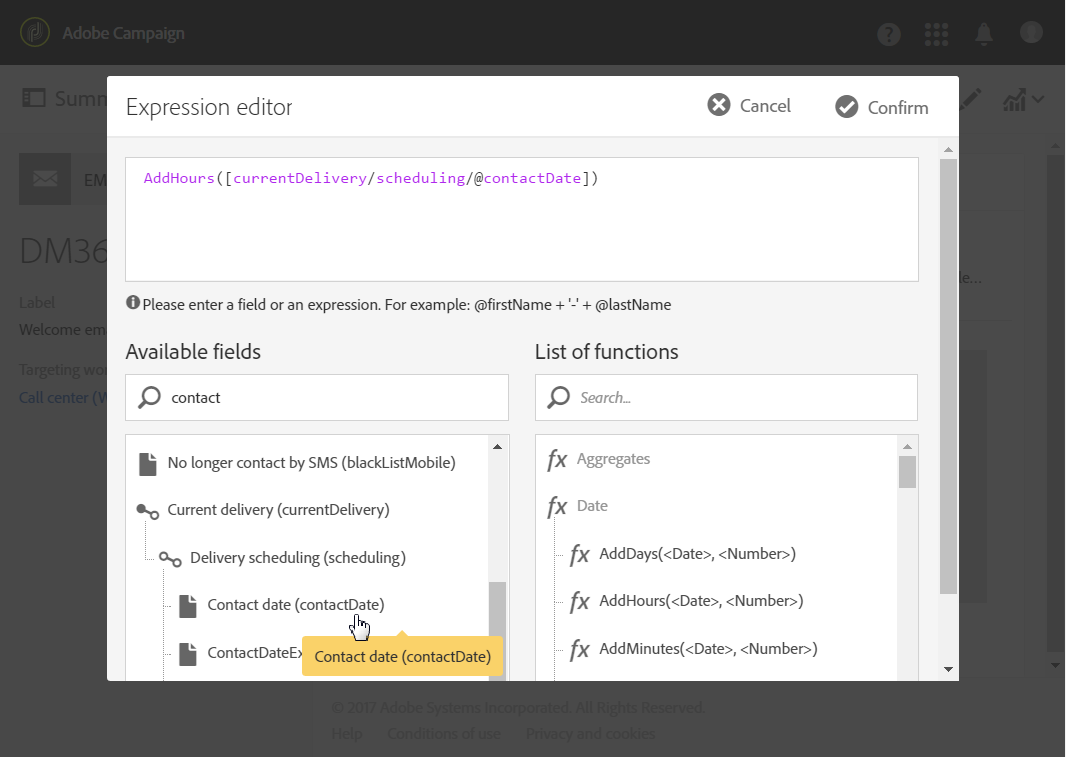 사용 가능한 필드에서 Current delivery > Delivery scheduling > Contact date.