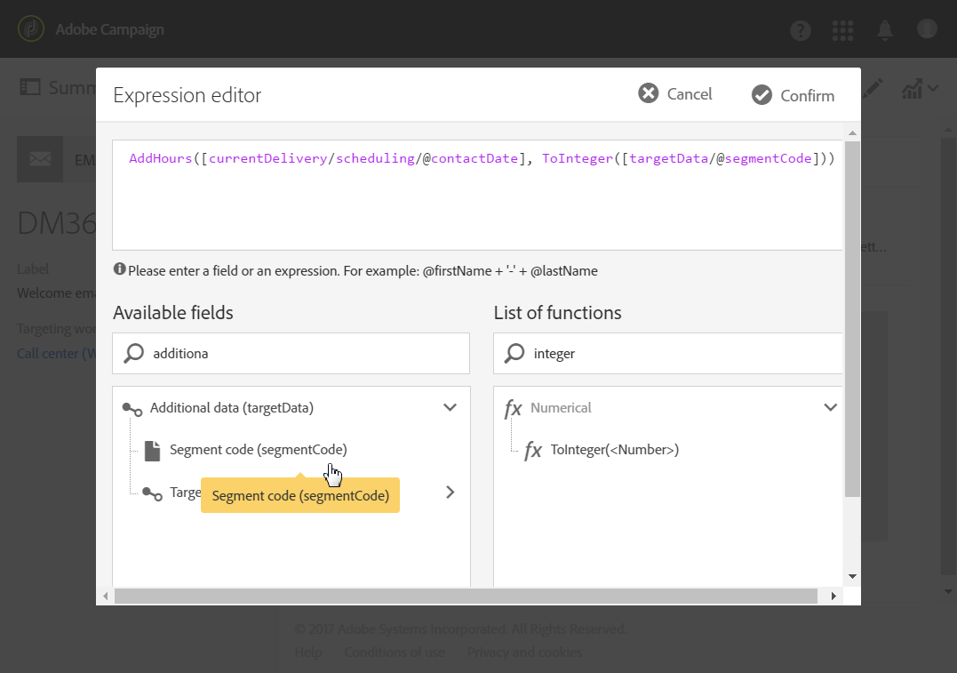 함수 목록에서 를 선택합니다 ToInteger. 사용 가능한 필드에서 Additional data > Segment code.