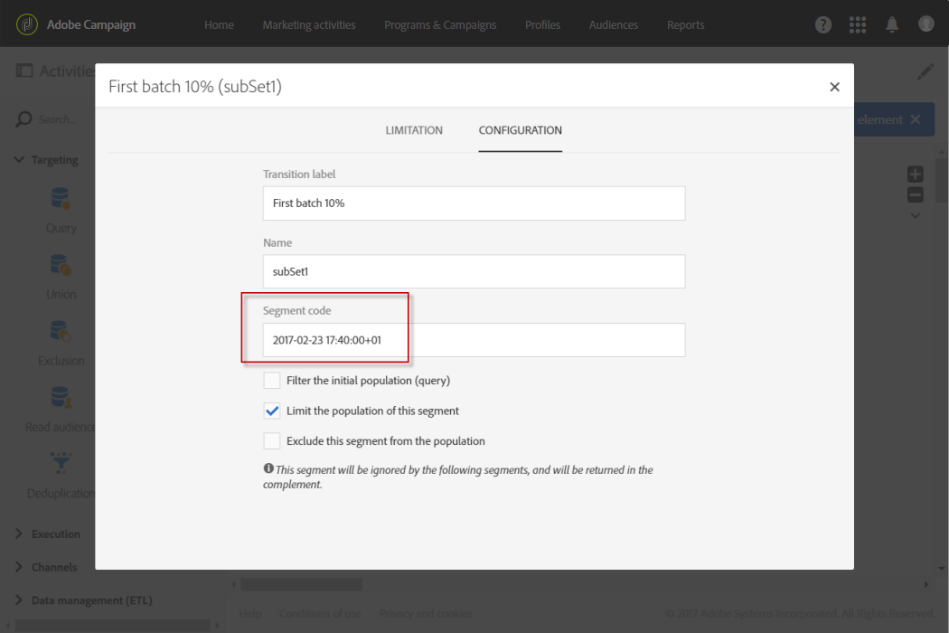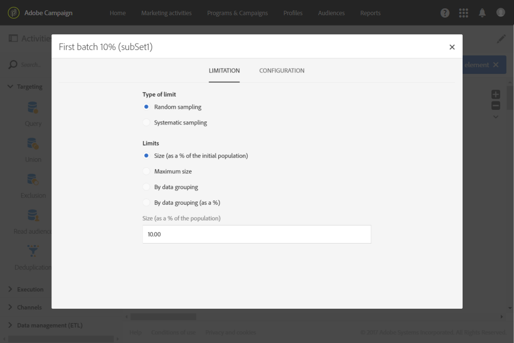 에서 Limitation 탭, 선택 Random sampling 및 각 세그먼트에 대해 원하는 백분율을 입력합니다. 첫 번째 배치의 경우 10, 두 번째 배치의 경우 15 등.
