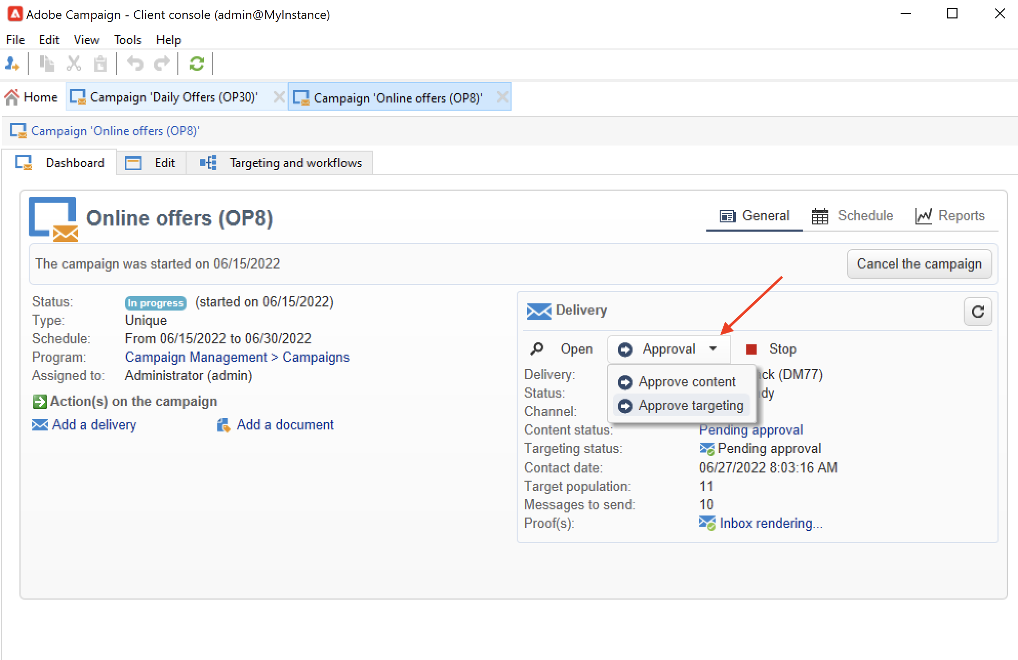 각 캠페인에 대해 게재 대상, 게재 콘텐츠 및 비용을 승인할 수 있습니다. 승인을 담당하는 Adobe Campaign 운영자는 이메일로 통보를 받을 수 있으며 클라이언트 콘솔 또는 웹 연결을 통해 승인을 수락하거나 거부할 수 있습니다. 자세히 알아보기.