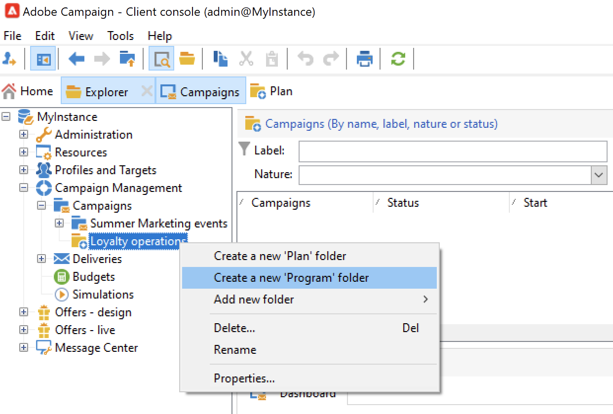 Seleccione Add new folder > Campaign Management > Plan.
