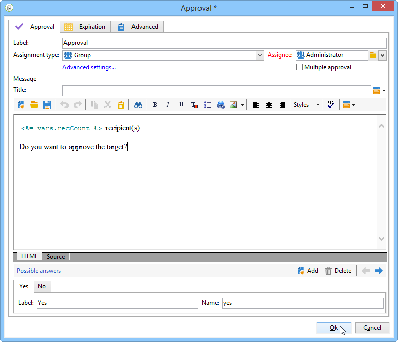 code language-none Do you wish to approve delivery (<%= vars.recCount %> recipient(s))?Este es un mensaje que incluye una expresión escrita en JavaScript: vars.recCount representa el número de destinatarios objetivo de la entrega de la tarea anterior. Para obtener más información sobre las expresiones JavaScript, consulte Plantillas y secuencias de comandos de JavaScript.