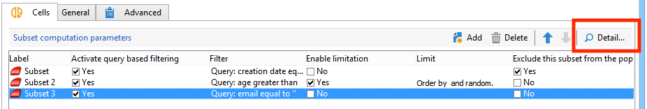 Die Aktivität Segmente bietet eine Ansicht der verschiedenen Teilmengen in Form von Datenspalten. Dies erleichtert die Bearbeitung von Teilmengen und ermöglicht die Nutzung von Personalisierungsfunktionen.