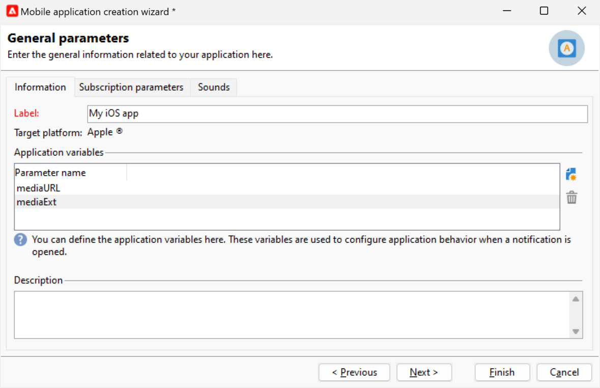 En la pestaña Application variables, Application variables se añaden automáticamente. Permiten definir el comportamiento de las notificaciones: por ejemplo, se puede configurar una pantalla específica de la aplicación que aparece cuando el usuario activa la notificación.