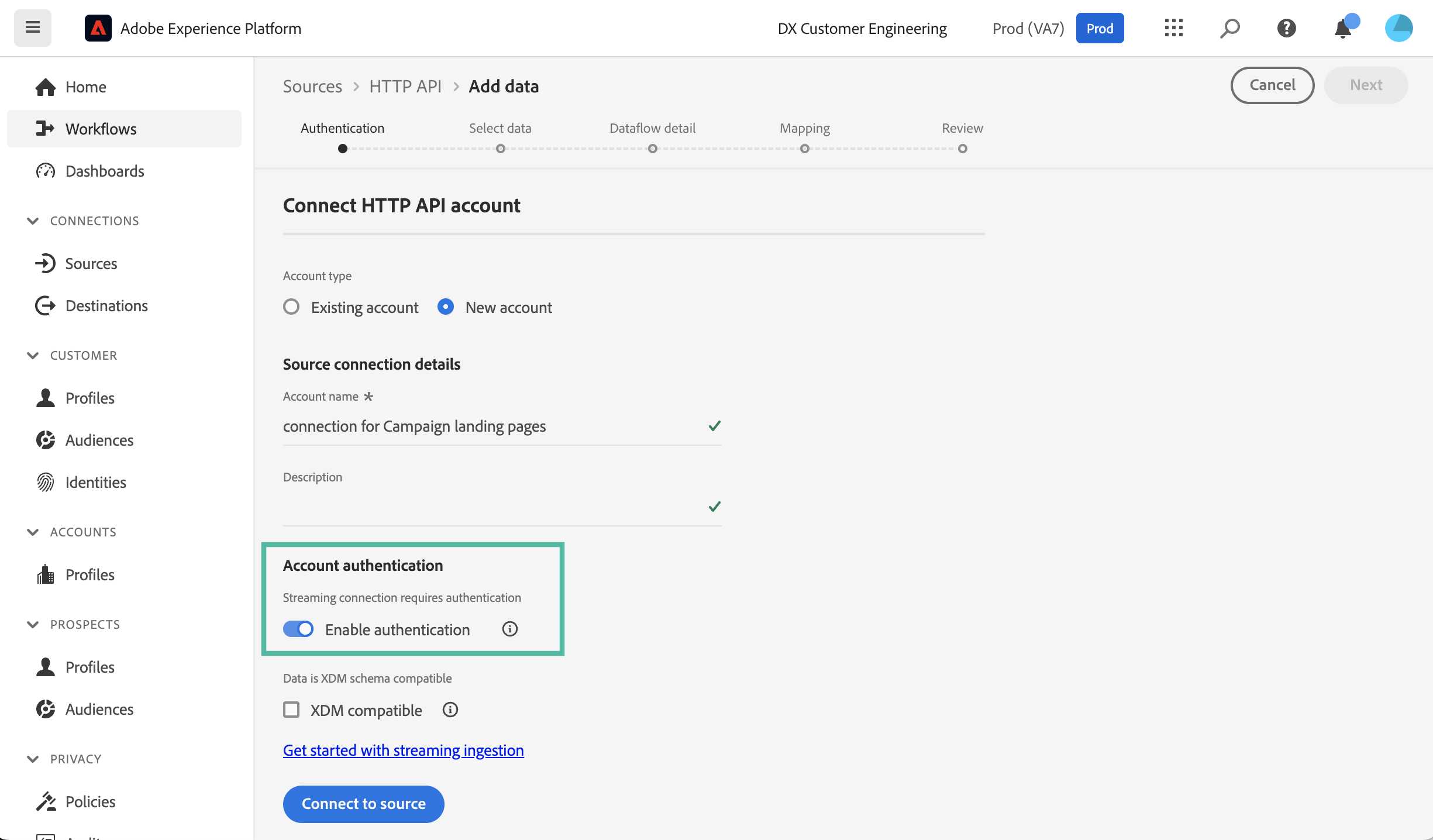 Una volta stabilita la connessione OAuth, il passaggio successivo consiste nel creare una connessione Source HTTP API in Adobe Experience Platform. Questa connessione ti consente di inviare dati a Adobe Experience Platform in streaming utilizzando le API. Segui questi passaggi: