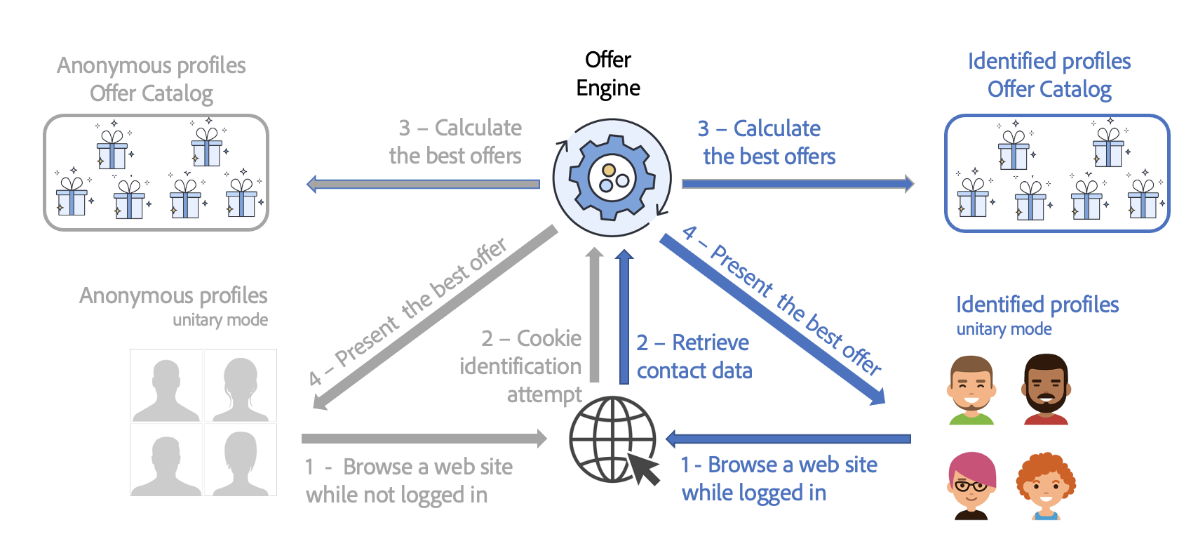 在入站联系人的上下文中,网站可以识别正在浏览页面的用户,也可以识别不存在的用户。 优惠引擎为已识别的用户档案和匿名用户档案提供不同的优惠。