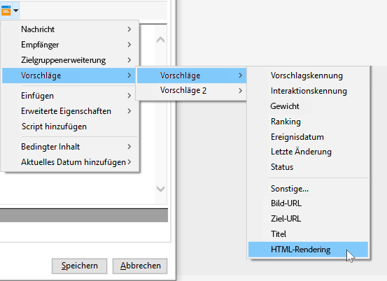 Wenn für die Platzierung, die Sie im Versand auswählen, keine HTML-Rendering-Funktion eingerichtet ist, wird sie nicht im Versandmenü angezeigt und kann nicht ausgewählt werden. Dies ist unabhängig von der Platzierung, die in der Aktivität Anreicherung ausgewählt wurde.