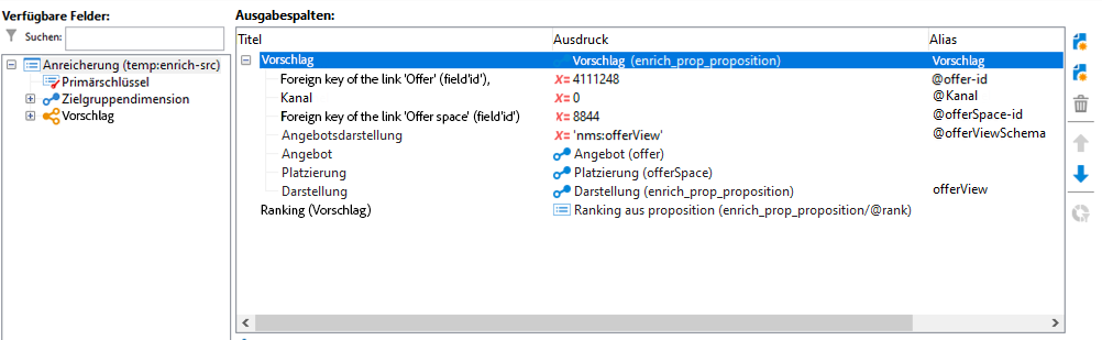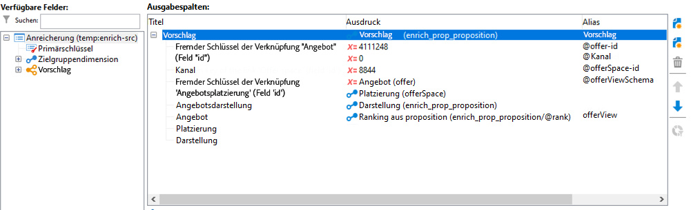 Wenn zum Beispiel in einer Workflow-Aktivität Anreicherung ein Angebot manuell (ohne Interaction) ausgewählt wird, sind die standardmäßigen Felder wie folgt definiert: