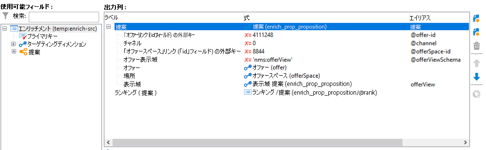アウトバウンドインタラクションを使用する場合、上記の例のように @rank フィールドを追加できますが、その値はインタラクションから返される順序に基づいて自動的に設定されます。例えば、インタラクションを使用して 3 つのオファーを選択する場合、@rank フィールドには 1、2 および 3 の値が返されます。