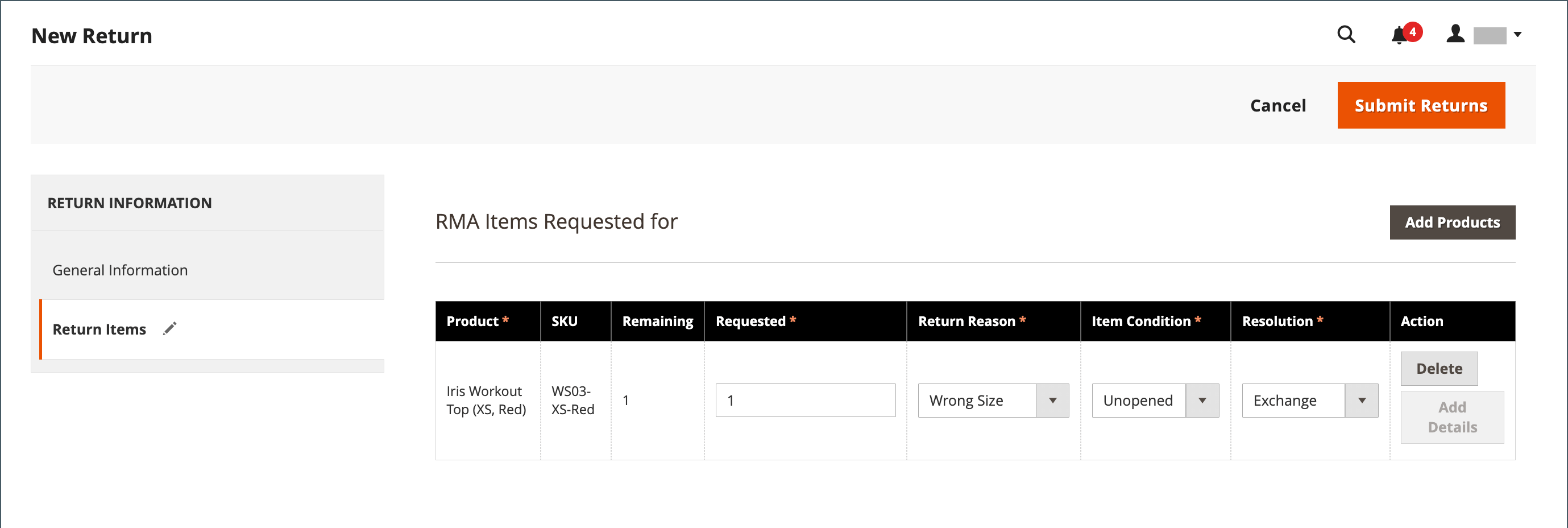 在 管理員 側邊欄上,移至 Sales > Returns。