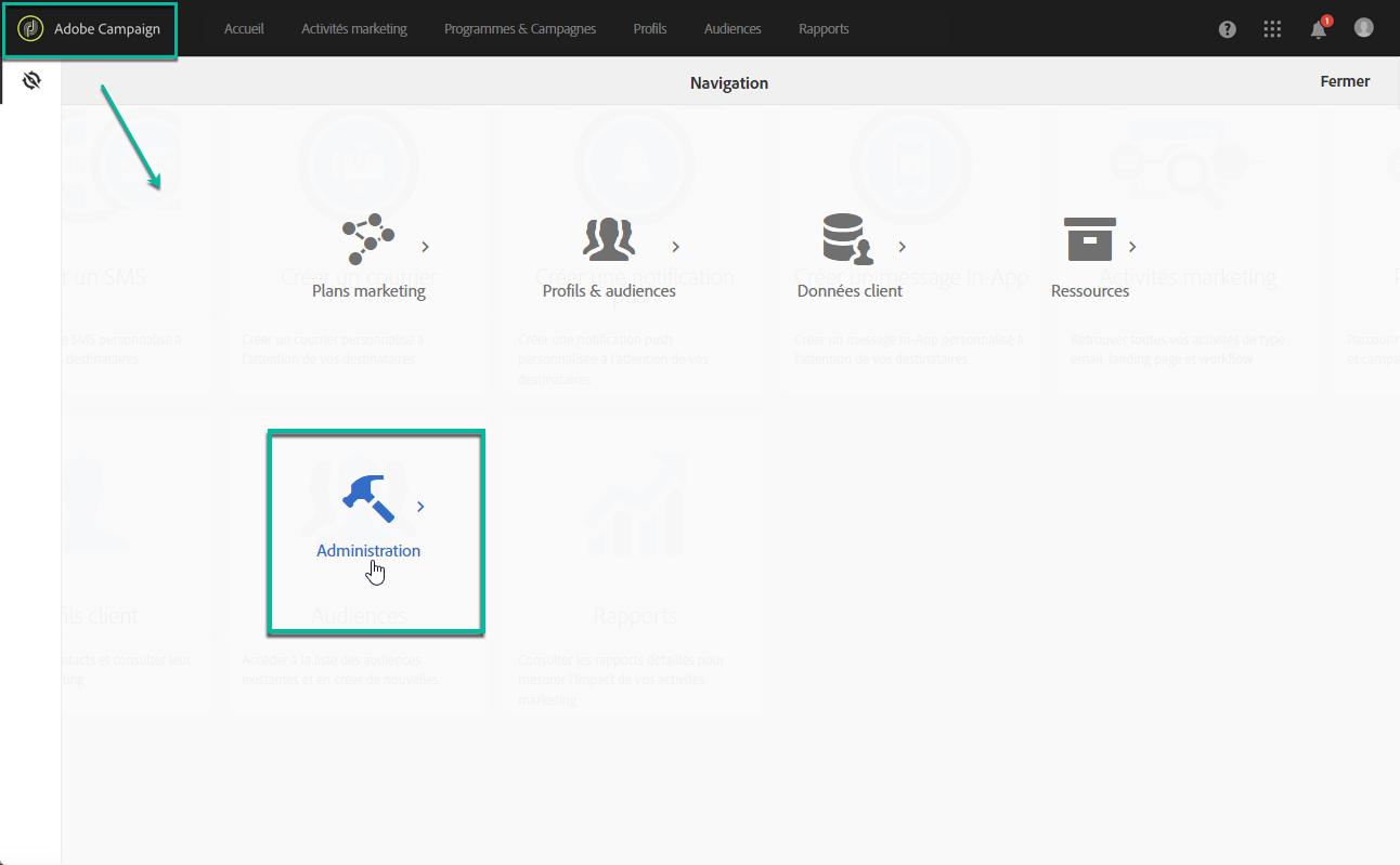 Sur la page d’accueil d’Adobe Experience Cloud, sélectionnez Campaign dans la section Accès rapide ou dans le menu supérieur droit.