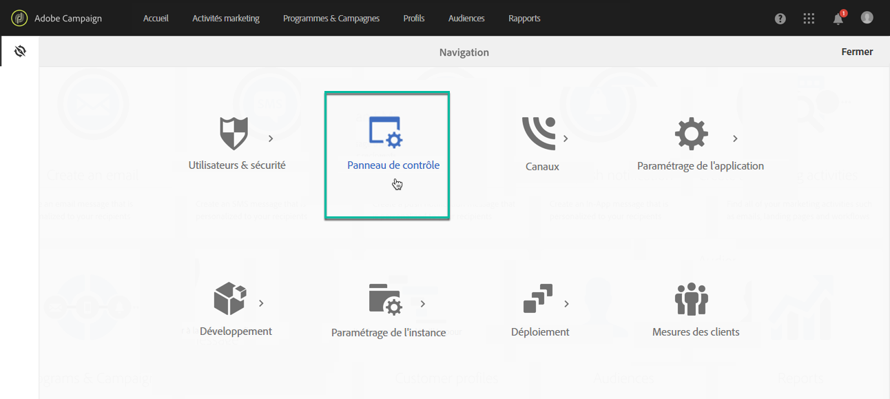Pour accéder au Panneau de contrôle à partir de la plateforme Adobe Experience Cloud, suivez la procédure ci-dessous.