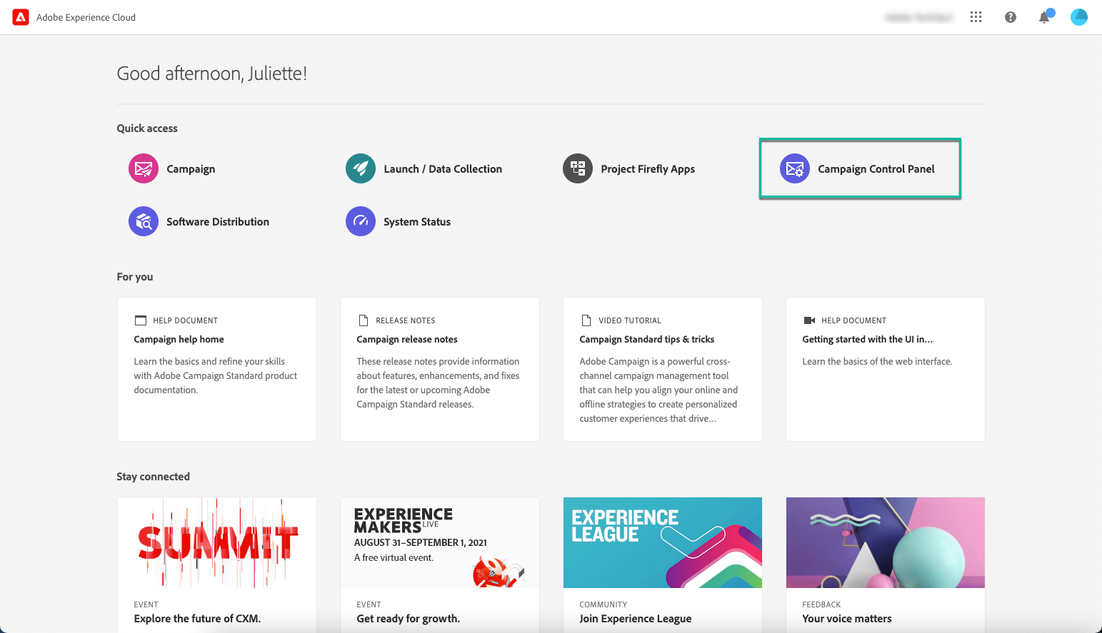 Le Panneau de contrôle est disponible directement depuis Experience Cloud ou depuis le produit lui-même.