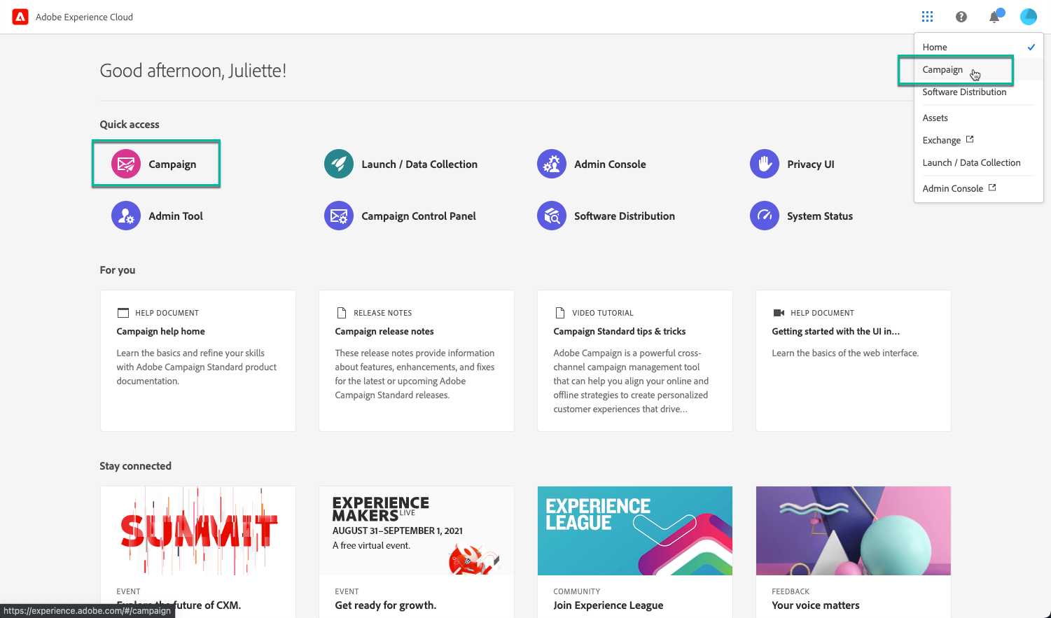 에서 Adobe Experience Cloud 홈페이지, 선택 캠페인 에서 빠른 액세스 섹션 또는 오른쪽 상단 메뉴 중에서 선택할 수 있습니다.