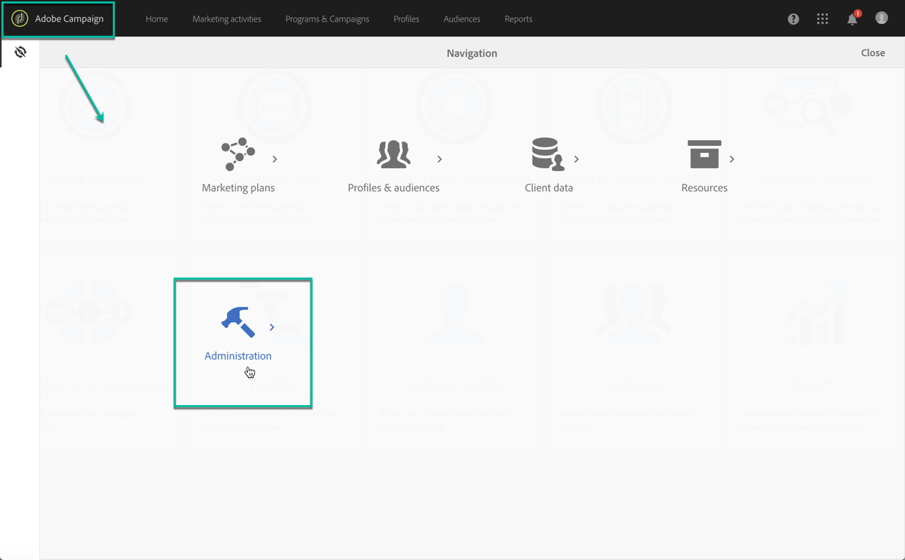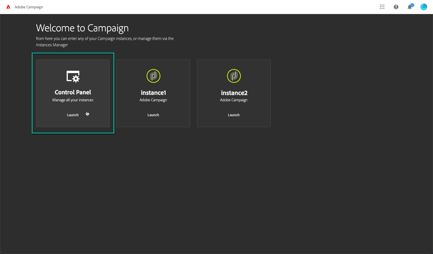 Adobe Experience Cloud 플랫폼에서 Campaign 컨트롤 패널에 액세스하려면 아래 단계를 따르십시오.