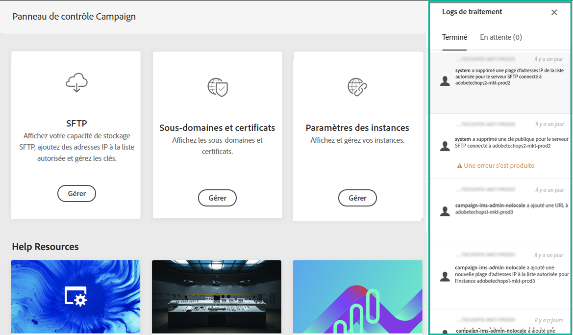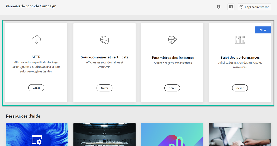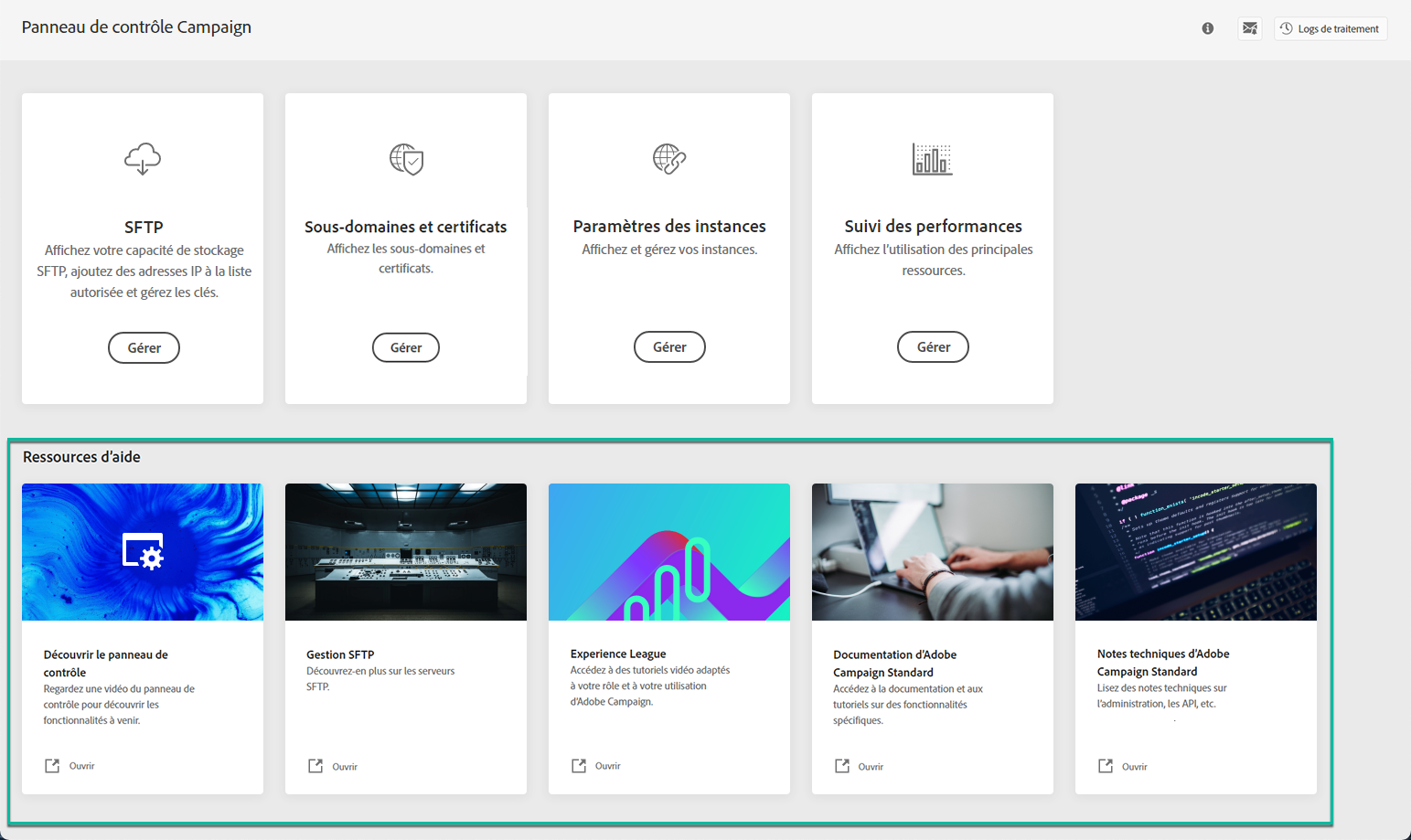 La section Ressources d’aide propose de la documentation pour vous aider à utiliser le Panneau de contrôle et les produits Campaign. N’hésitez pas à l’explorer.