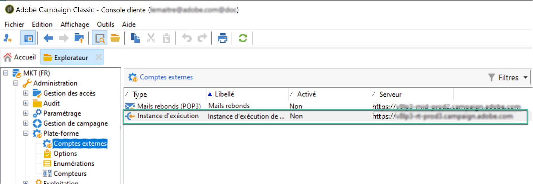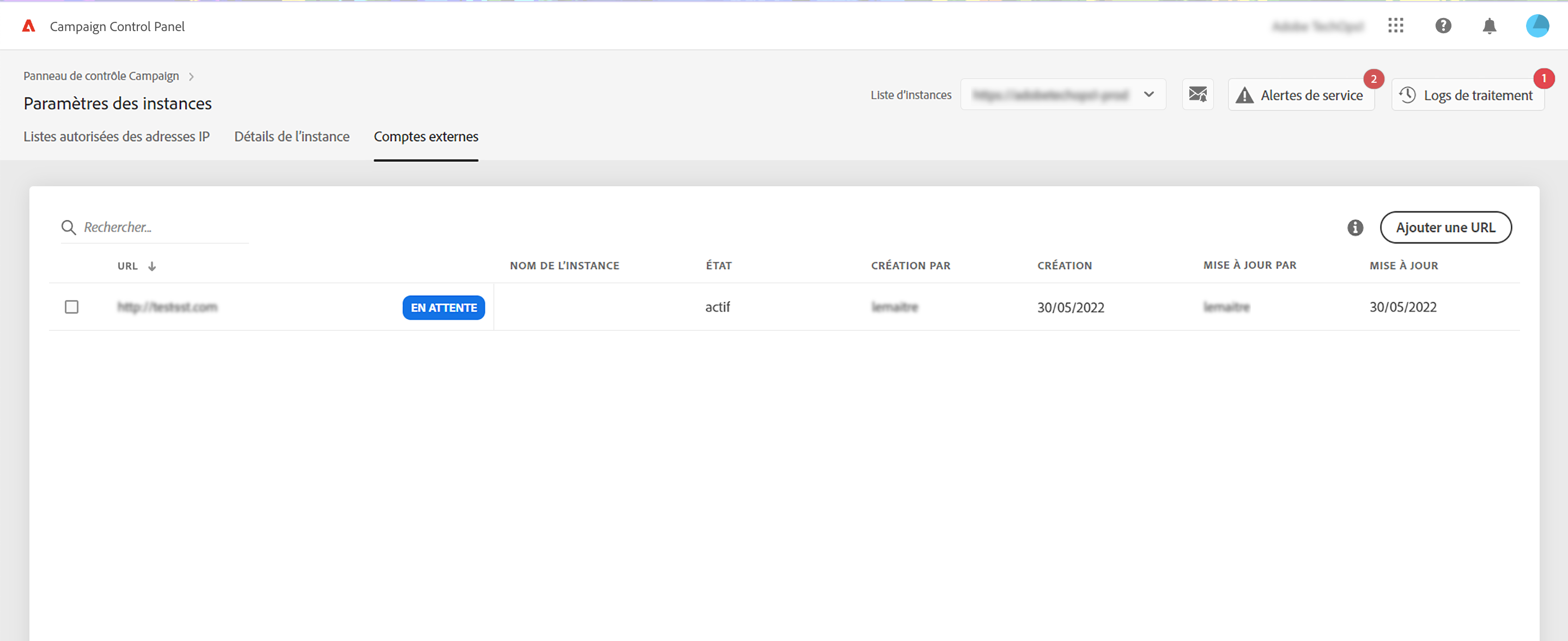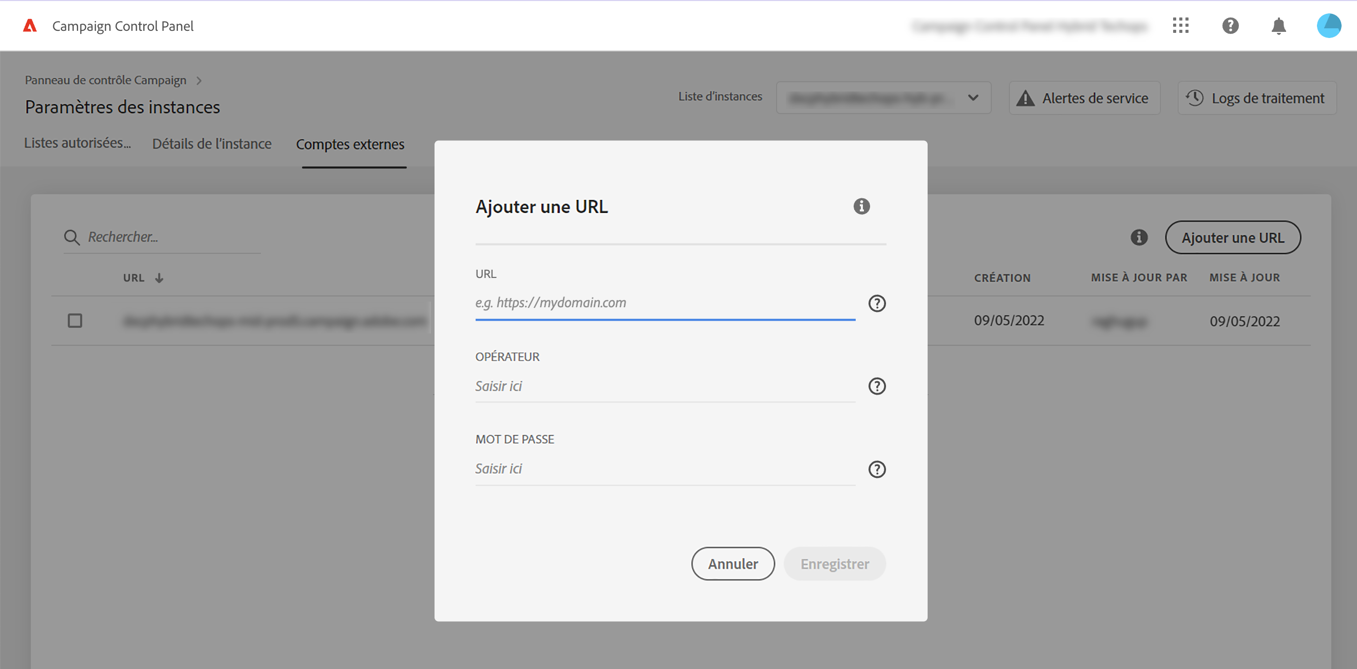 URL : URL de l’instance, qui peut être trouvée dans la console client de Campaign dans le menu Administration > Plateforme > Comptes externes.