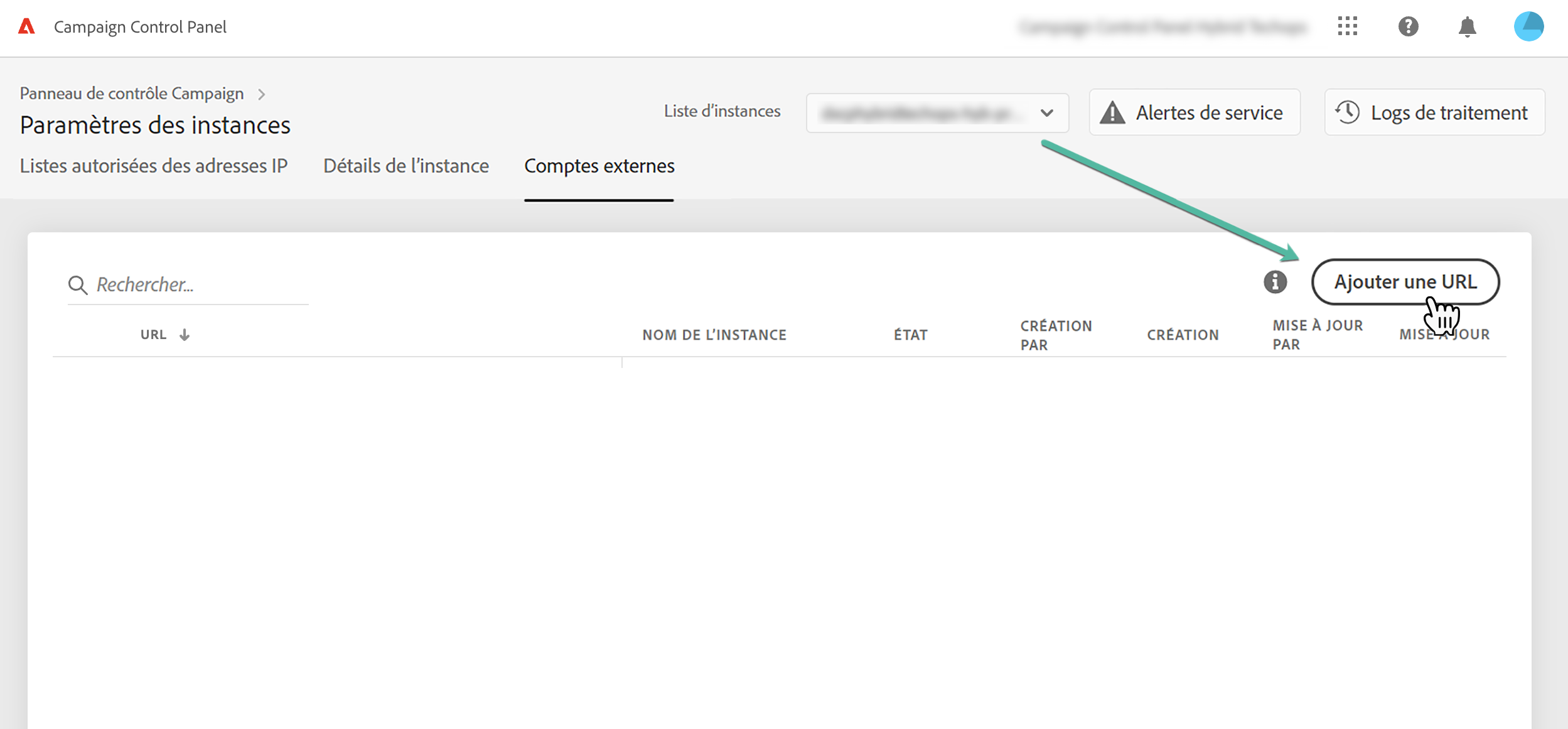 Sélectionnez l’instance marketing désirée dans la liste déroulante, puis cliquez sur Ajouter une nouvelle URL.