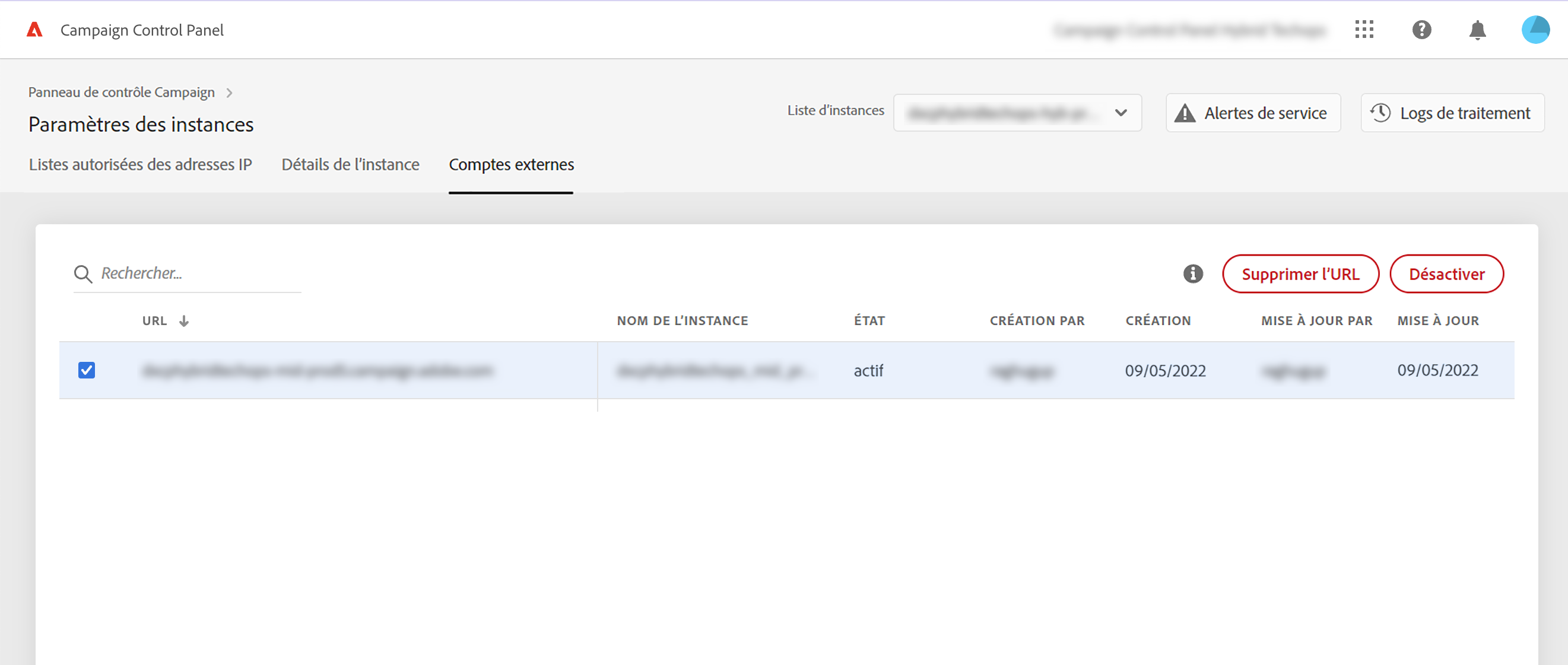 Vous pouvez supprimer ou désactiver l’URL d'une instance MID/RT à tout moment en la sélectionnant dans la liste.