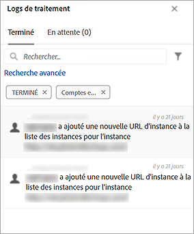 Notez que vous pouvez surveiller toute action effectuée dans l’onglet Comptes externes sur une URL d’instance MID/RT à partir des Logs de traitement :