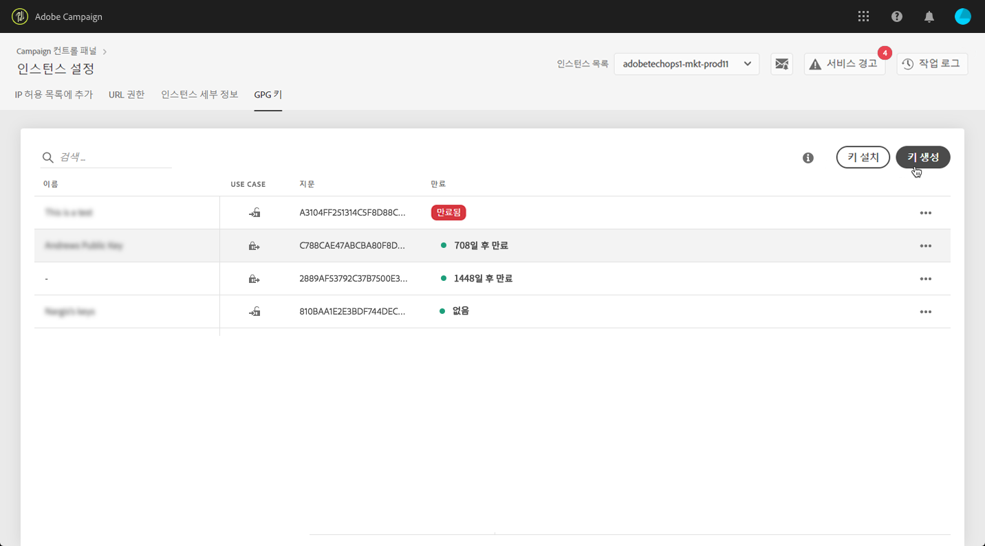 를 엽니다. Instance settings 카드를 선택한 다음 GPG keys 탭 및 원하는 Adobe Campaign 인스턴스.