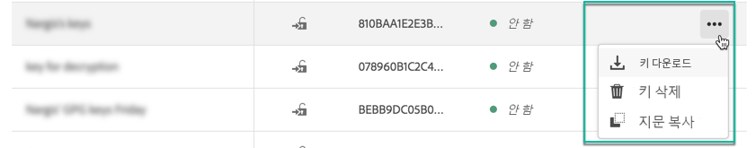 공개 키가 설치되면 목록에 표시됩니다. 를 사용할 수 있습니다 … 단추를 클릭하여 다운로드하거나 지문을 복사합니다.