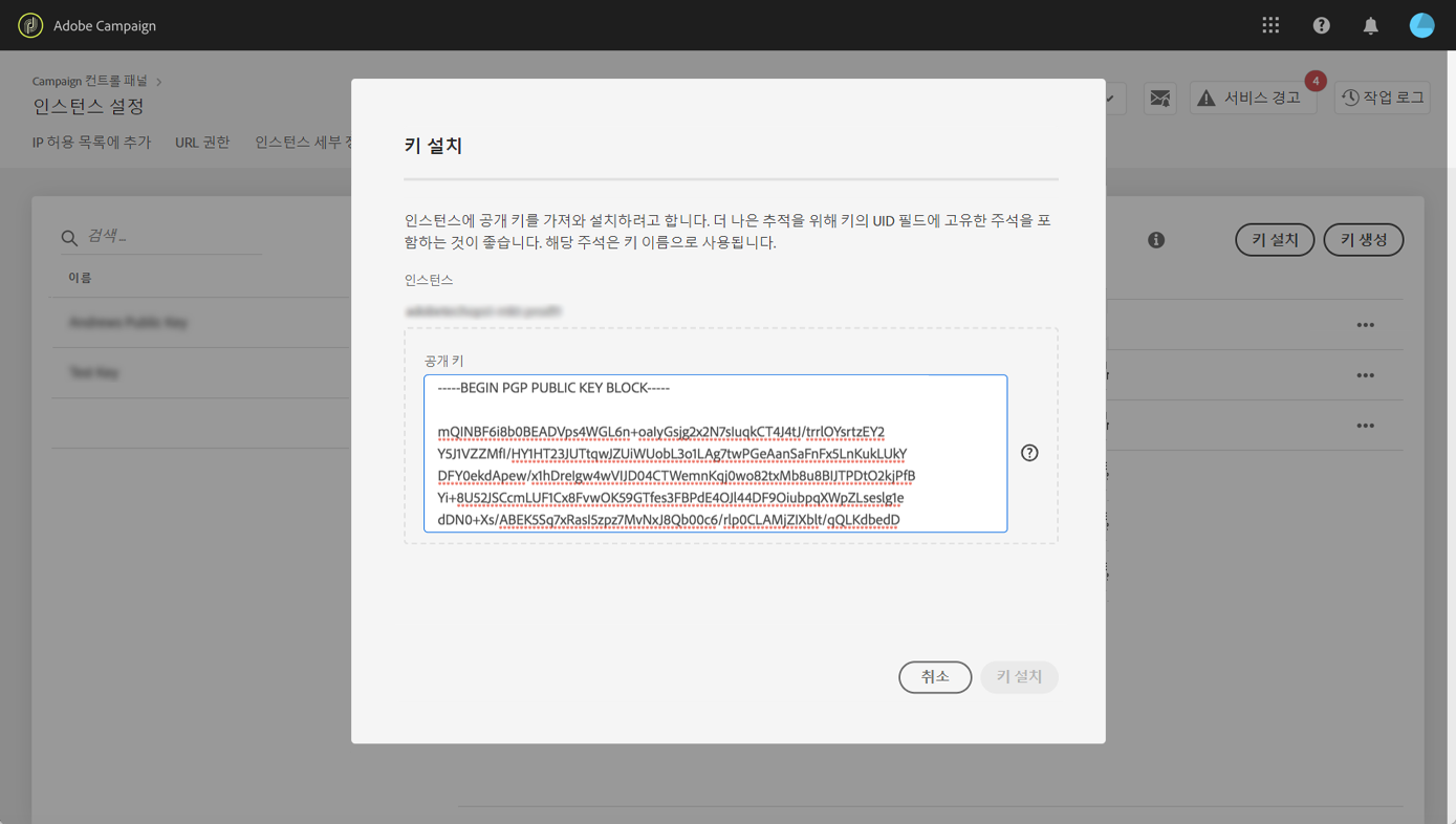 공개 키를 Campaign 컨트롤 패널에 설치하려면 Instance settings 카드를 선택한 다음 GPG keys 탭하고 원하는 인스턴스를 만들 수 있습니다.