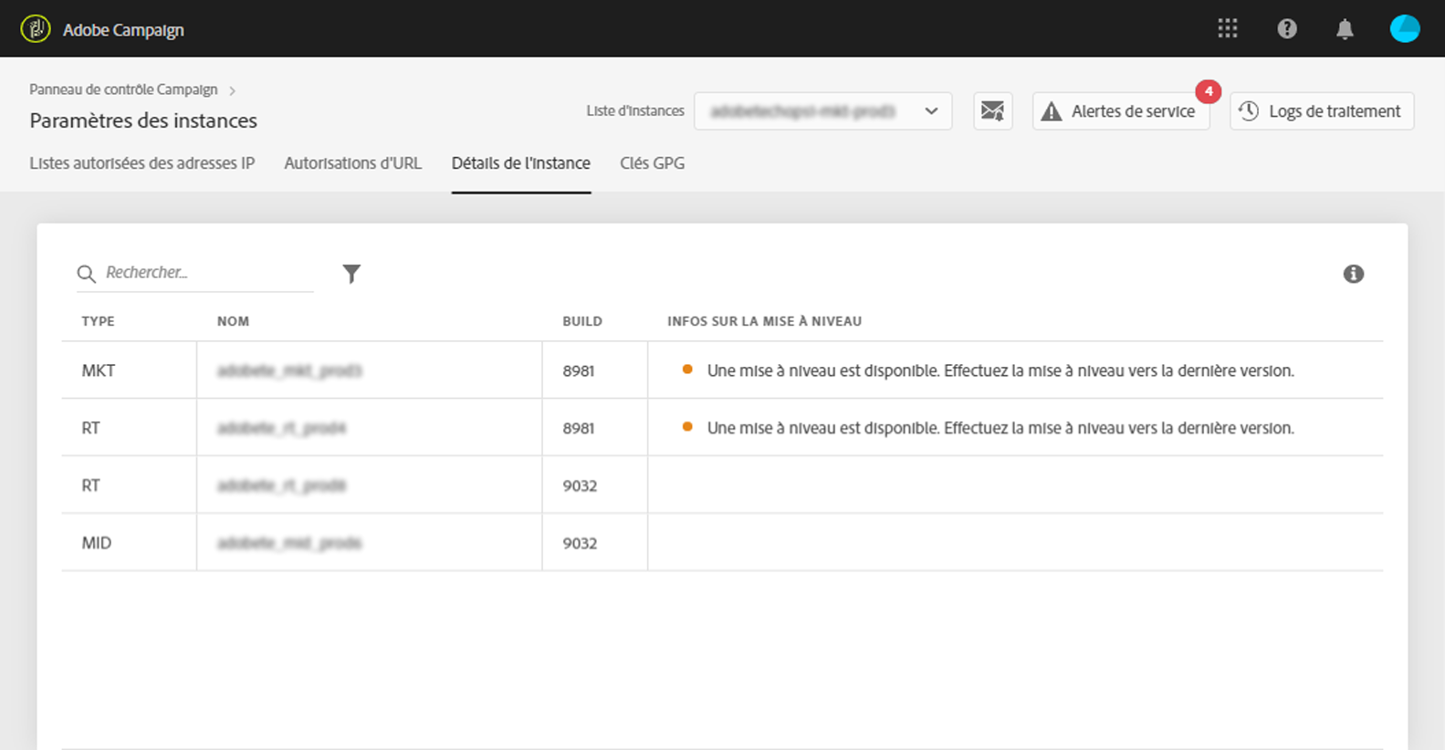 La fonctionnalité Détails de l’instance vous permet d’afficher l’architecture plane de votre instance. En plus de fournir des informations sur le serveur, elle vous permet également de savoir si le build de votre instance est à jour ou pas et vous indique les upgrades recommandés lorsque cela est nécessaire.