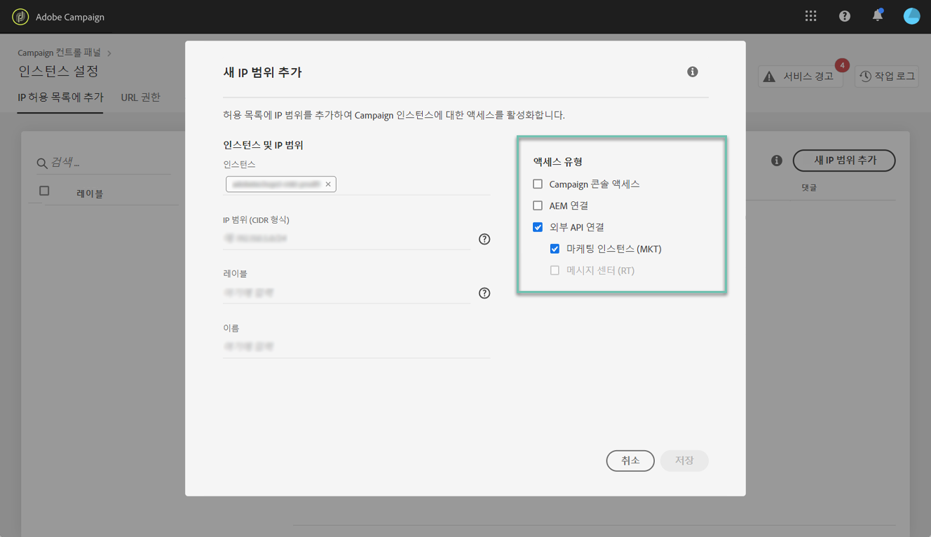 IP 주소를 허용 목록에 추가하지 않은 경우에는 해당 주소에서 인스턴스에 로그인할 수 없습니다. 마찬가지로 IP 주소를 인스턴스의 허용 목록에 명시적으로 추가하지 않은 경우 메시지 센터 또는 마케팅 인스턴스에 API를 연결하지 못할 수 있습니다.