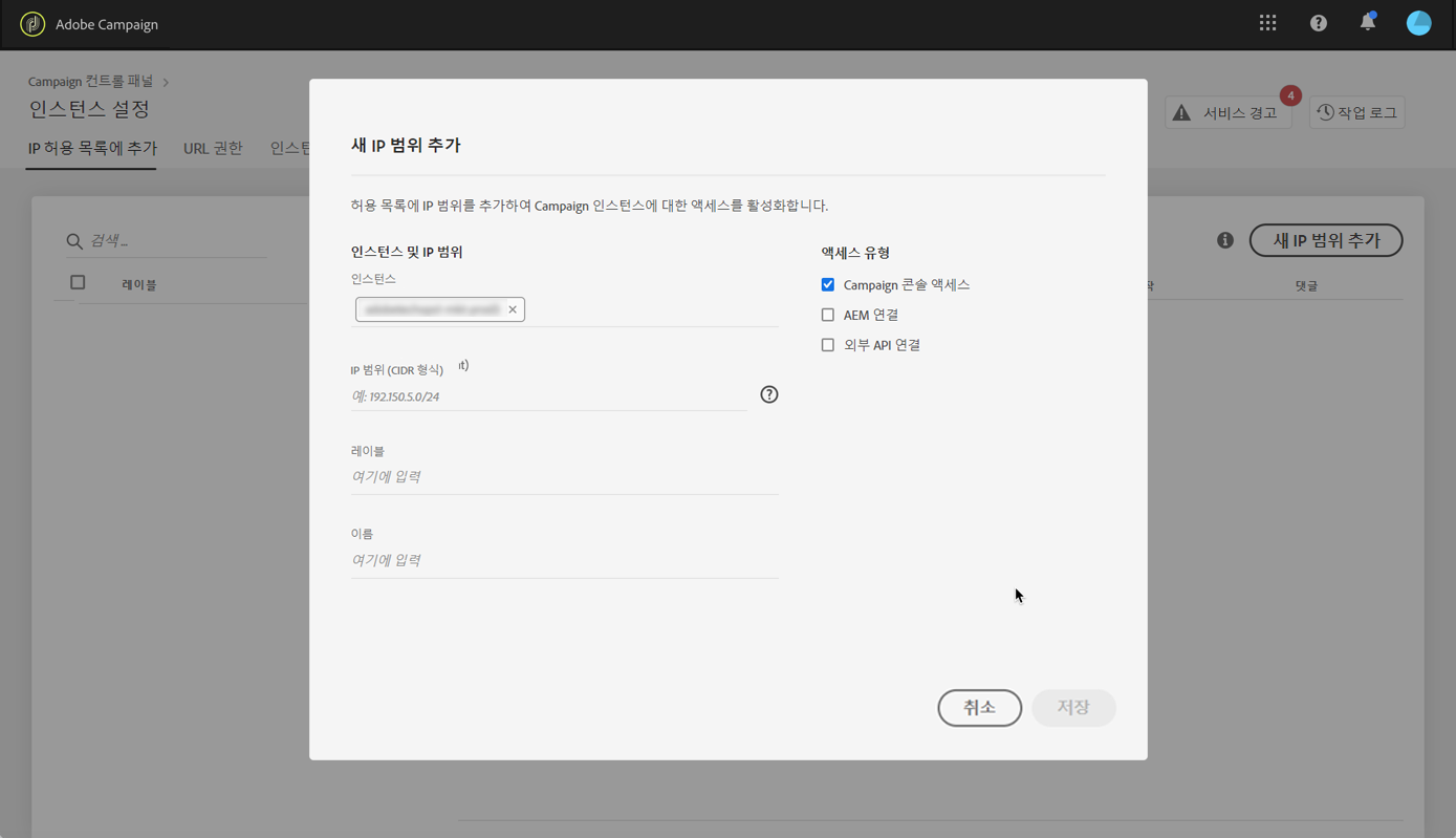 기본적으로는 여러 IP 주소에서 Adobe Campaign 인스턴스에 액세스할 수 없습니다.
