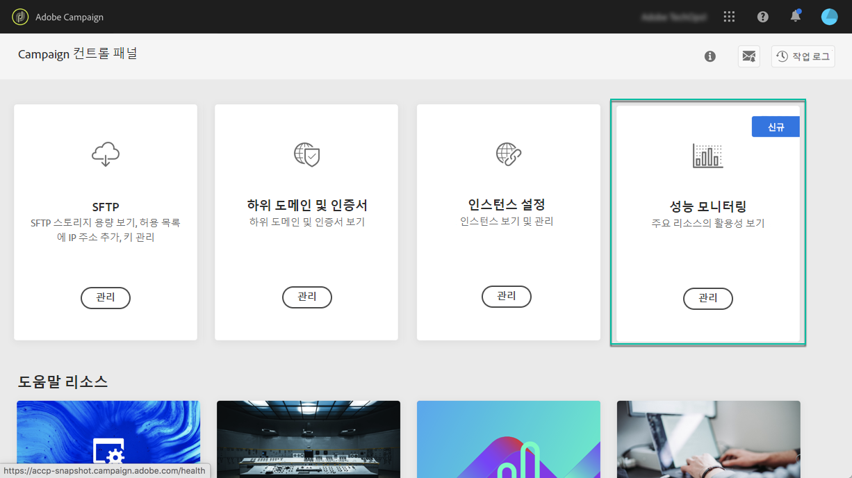 컨트롤 패널 홈페이지의 성능 모니터링 카드를 사용하면 데이터베이스 용량 등 캠페인 인스턴스의 사용량을 모니터링할 수 있습니다. 이 작업에 대한 자세한 정보는 이 섹션을 참조하십시오.