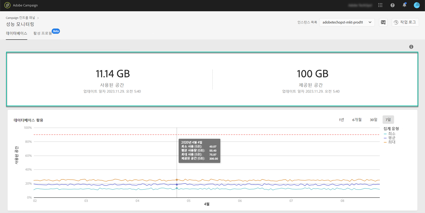 컨트롤 패널을 사용하면 각 캠페인 인스턴스에 대한 데이터베이스 사용량을 모니터링할 수 있습니다. 이렇게 하려면 성능 모니터링 카드를 연 다음 데이터베이스 탭을 선택하십시오.