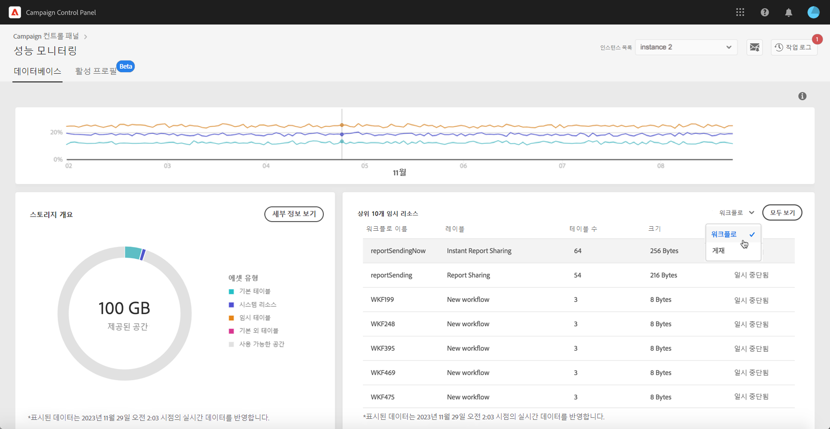 대규모 임시 리소스를 생성하는 워크플로우 및 게재 모니터링은 데이터베이스를 모니터링하는 중요한 단계입니다. 임시 리소스가 너무 많은 데이터베이스 공간을 사용하는 경우, 해당 워크플로우나 게재가 필요한지 확인하고, 해당 인스턴스로 이동하여 중지해야 합니다.
