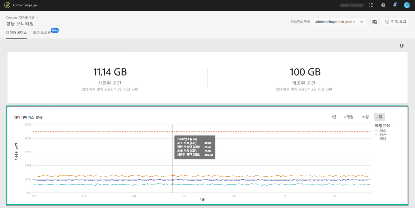 Database utilization 영역은 빨간색 점선 곡선으로 표현되는 90% 데이터베이스 사용 임계값과 지난 7일 동안의 최소, 평균 및 최대 데이터베이스 사용률을 그래픽으로 표시합니다.