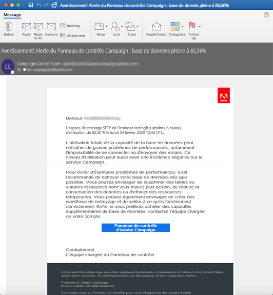 Une fois votre abonnement effectué, le Panneau de contrôle vous avertira des problèmes du système et vous recommandera les mesures à prendre. Les alertes par email sont envoyées à toutes les personnes pour toutes les instances qu’elles administrent.