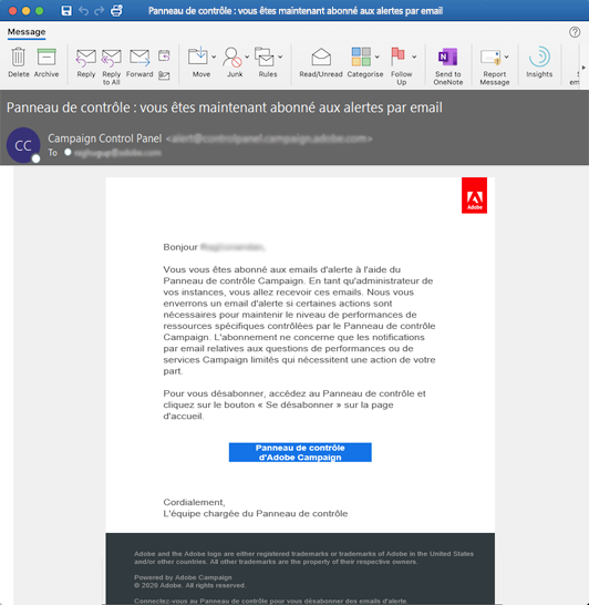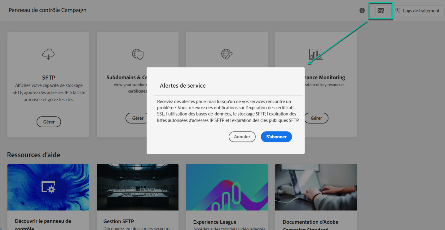 Cliquez sur le bouton Notifications d’alertes disponible à n’importe quel emplacement du Panneau de contrôle, puis cliquez sur S’abonner.
