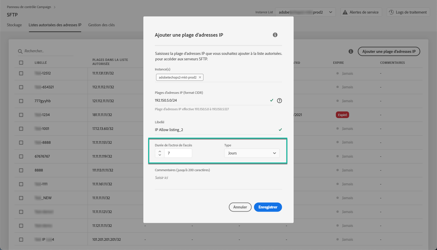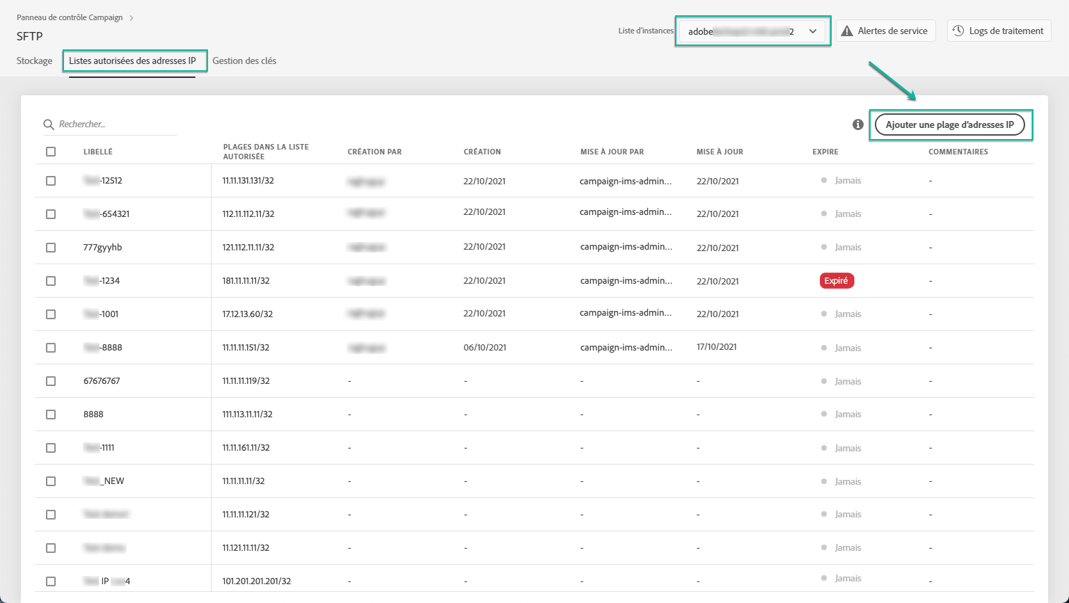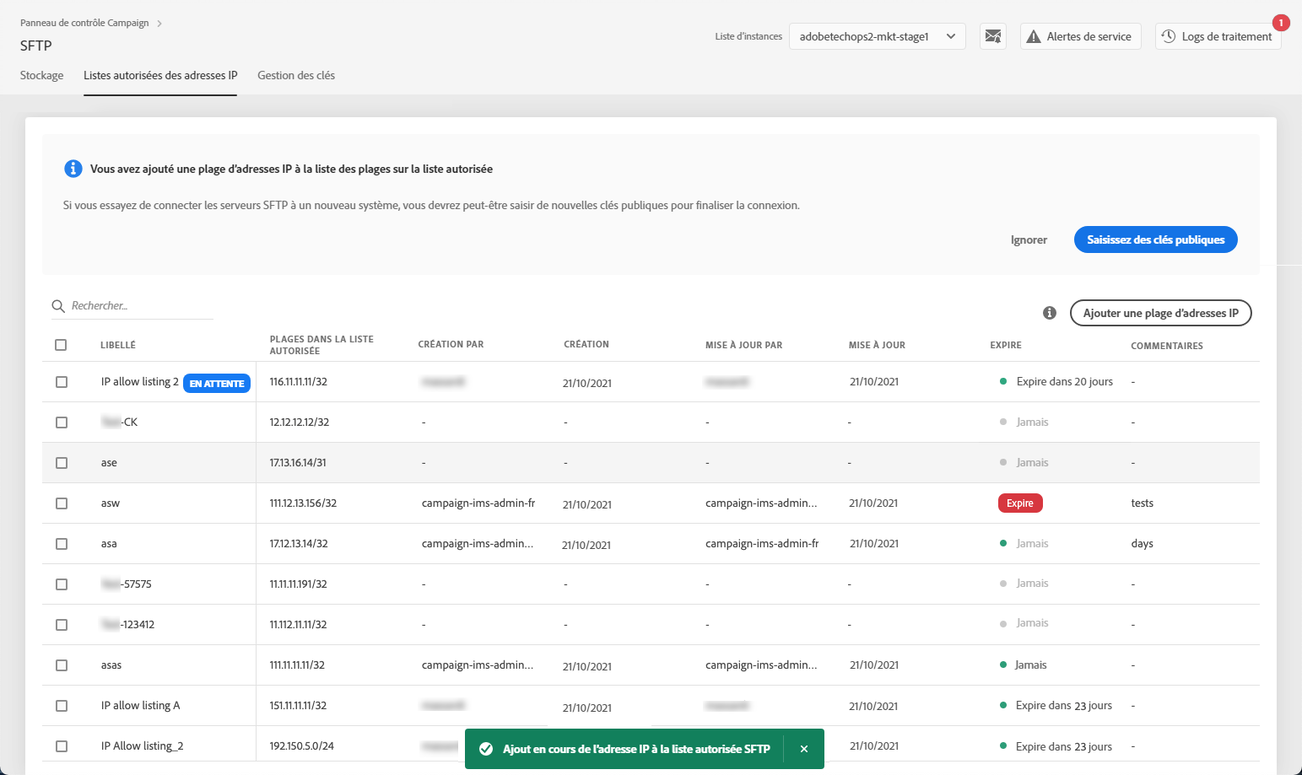 Une plage dʼadresses IP arrivée à expiration ne peut plus être utilisée pour accéder aux serveurs SFTP.
