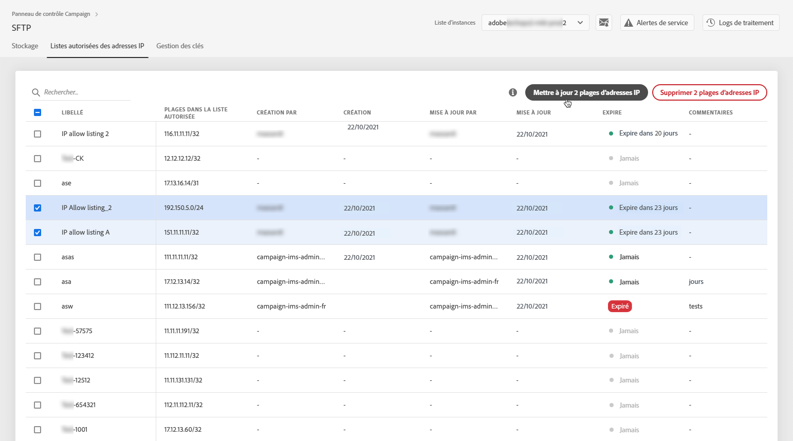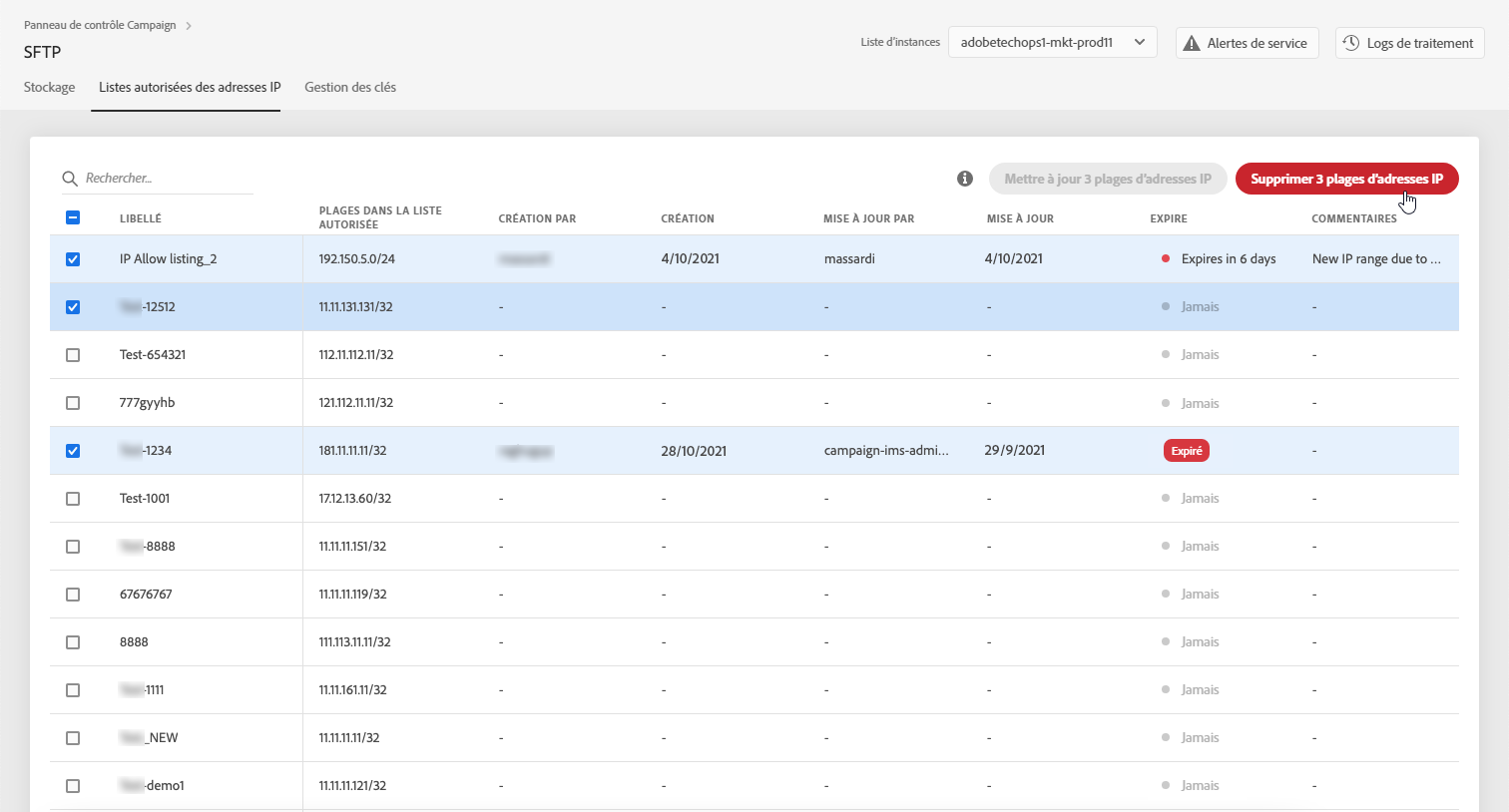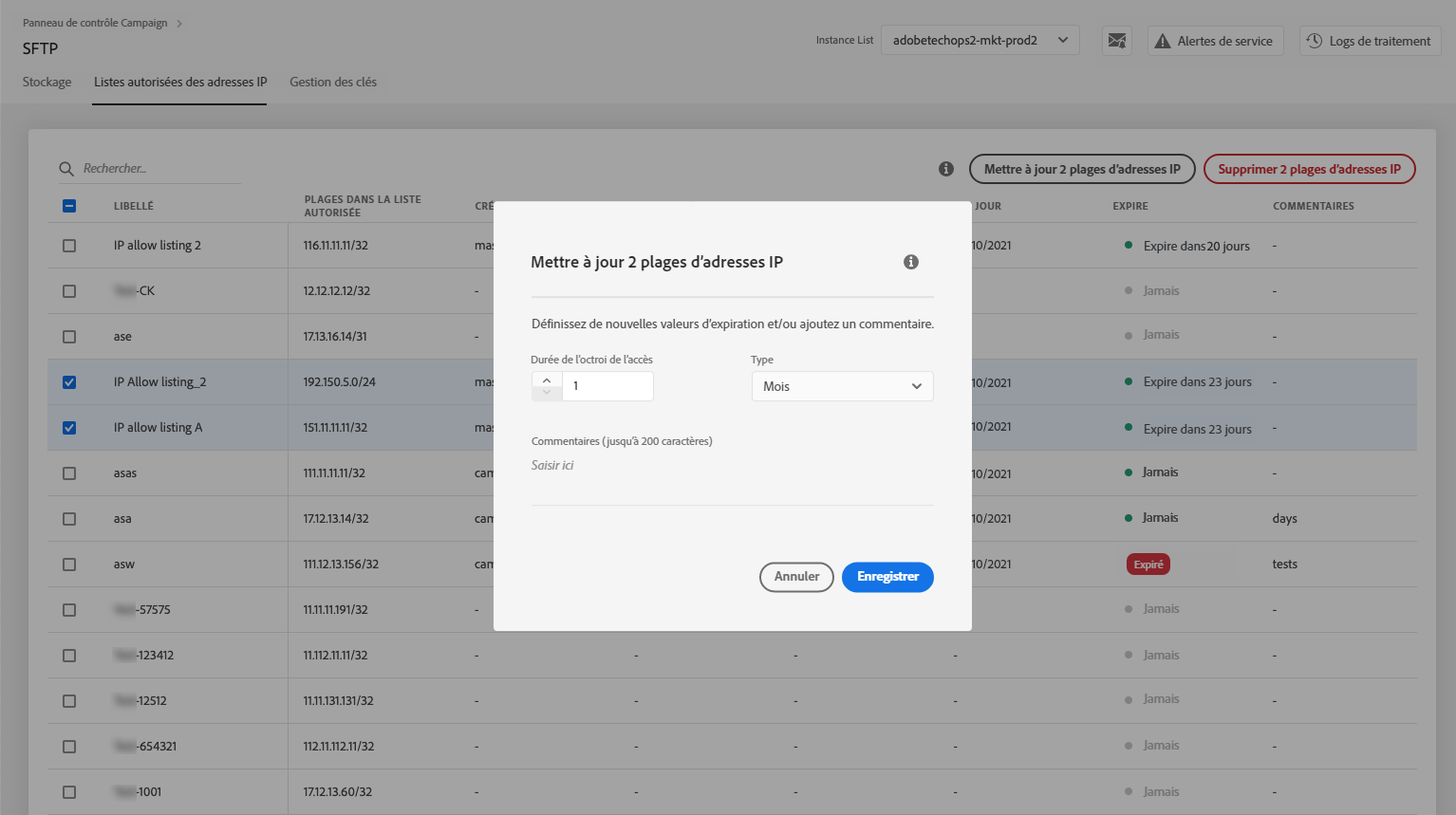 Une plage dʼadresses IP arrivée à expiration ne peut plus être utilisée pour accéder aux serveurs SFTP.