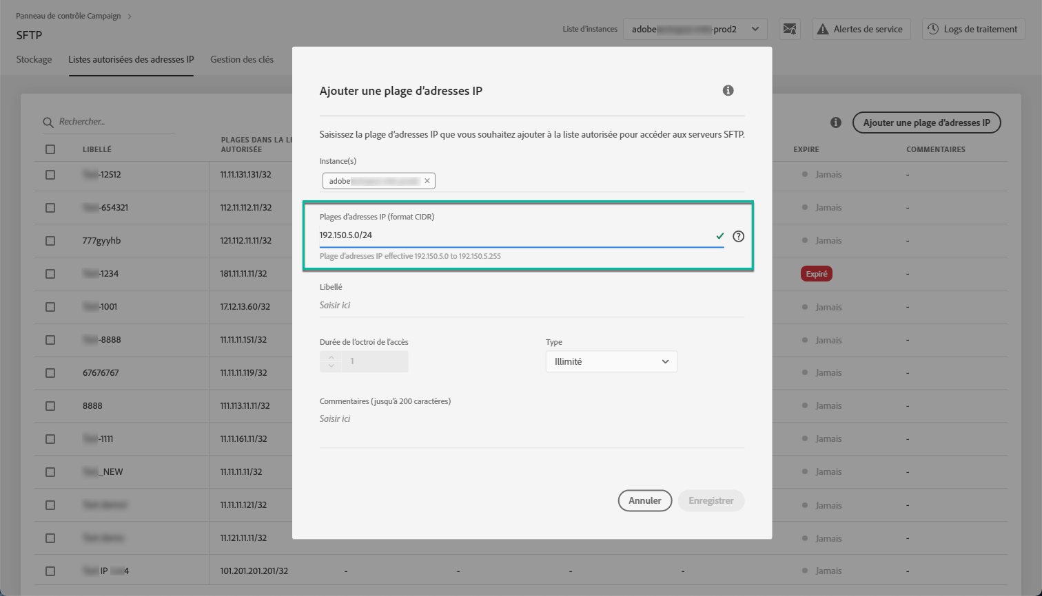 Définissez la plage d’adresses IP que vous souhaitez ajouter à la liste autorisée. Ce champ accepte uniquement les plages d’adresses IP au format CIDR, par exemple 192.150.5.0/24.