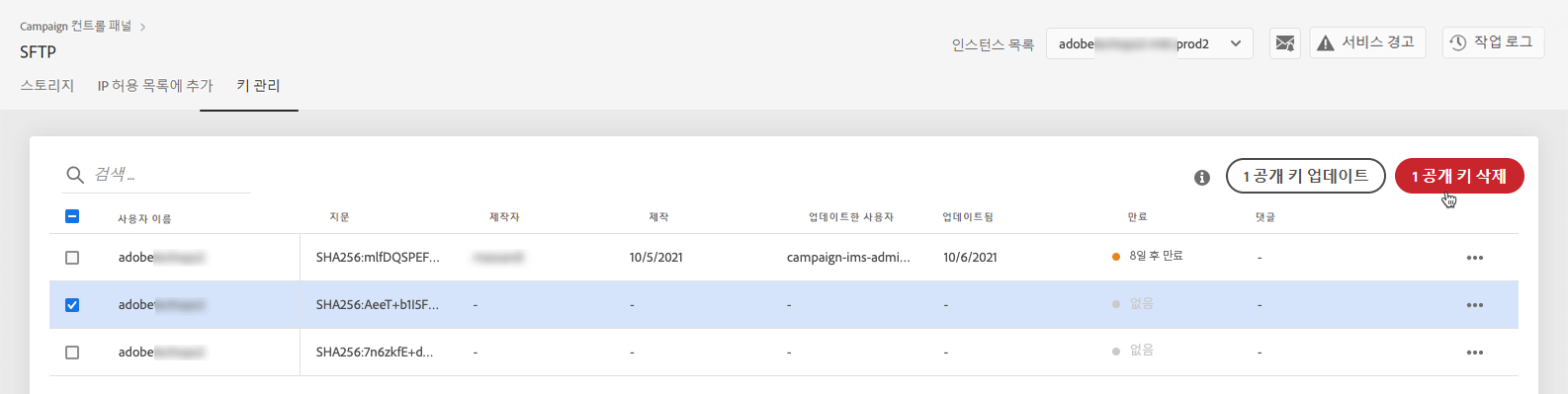 목록에서 공개 키를 하나 이상 삭제하려면 해당 키를 선택한 다음 Delete public key 버튼을 클릭합니다.