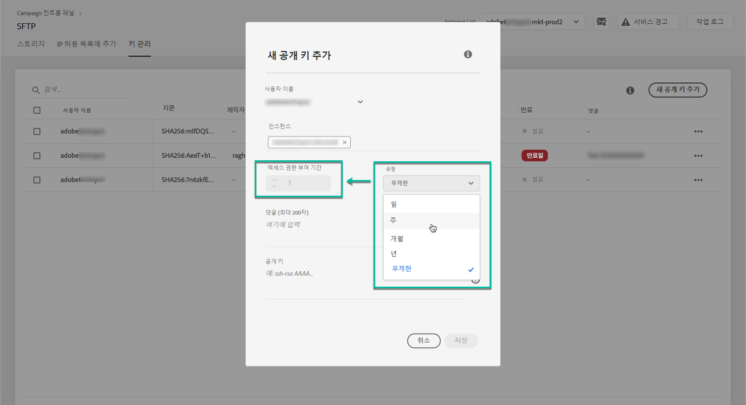 공개 키를 보다 효율적으로 관리하기 위해 각 키의 가용성에 대한 기간을 설정할 수 있습니다. 이렇게 하려면 Type 드롭다운 목록을 나열하고 해당 필드에 기간을 정의합니다. 공개 키 만료에 대한 자세한 내용은 이 섹션.