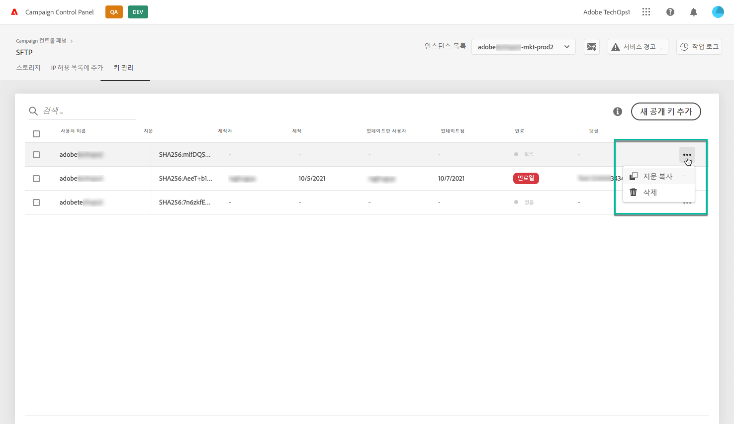 "…" 버튼을 사용하면 기존 키를 삭제하거나 연결된 지문을 클립보드에 복사할 수 있습니다.