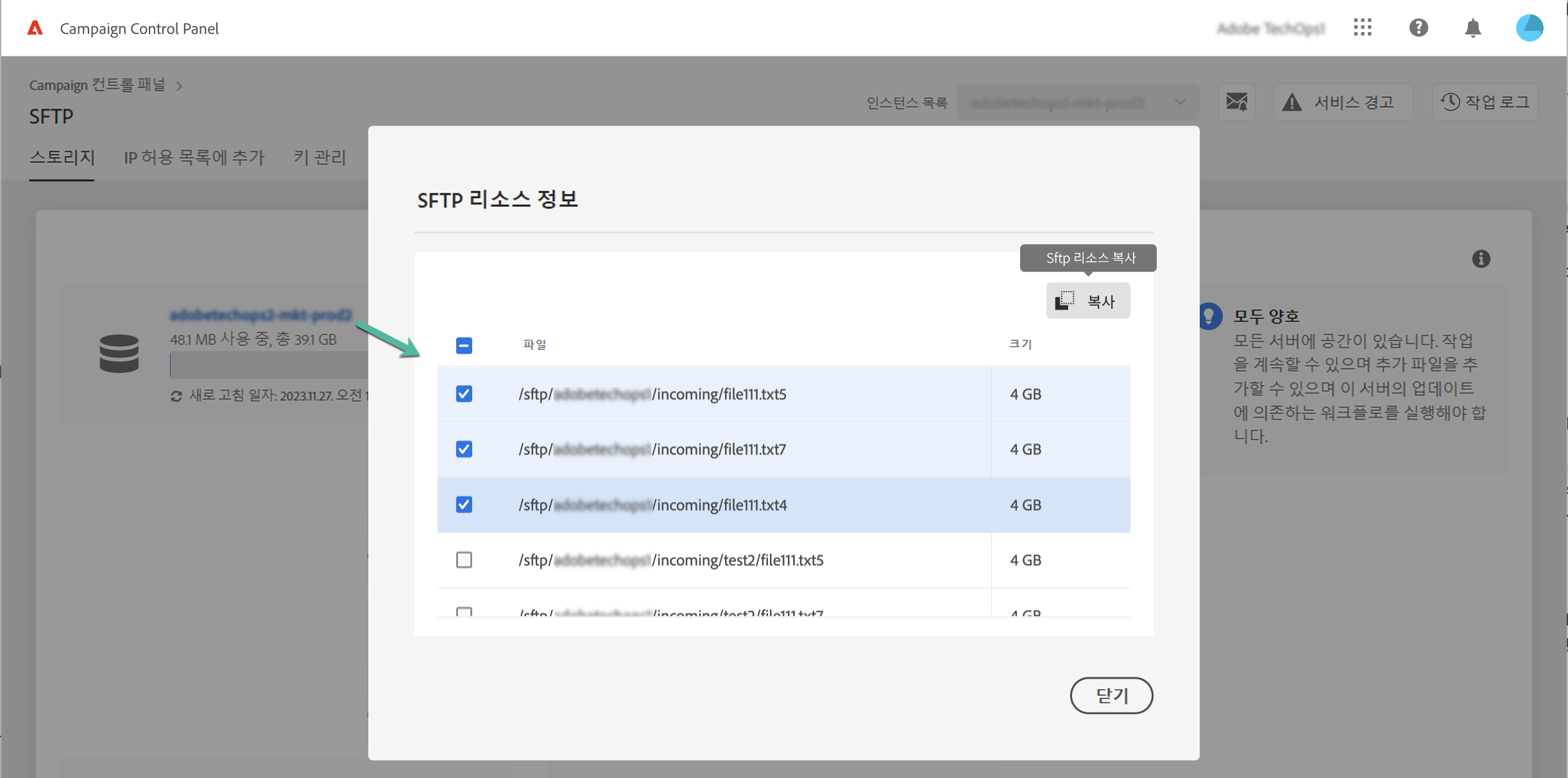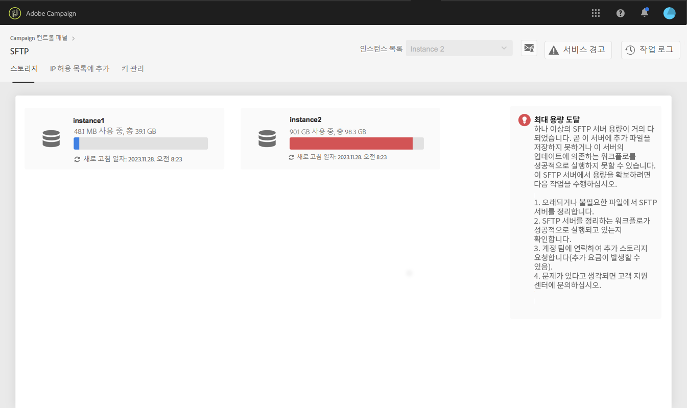 액세스 권한이 있는 모든 인스턴스에서 사용하는 공간 관련 정보는 SFTP 카드의 Storage 탭에서 제공됩니다. 페이지를 새로 고칠 때마다 정보가 업데이트됩니다.