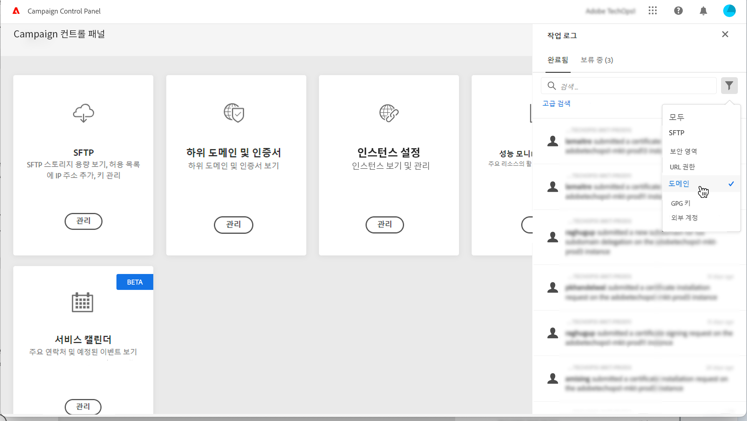 에서 Job Logs에서 을(를) 선택합니다. Finished 탭을 클릭한 다음 목록을 필터링하여 하위 도메인 관리와 관련된 작업을 표시합니다.