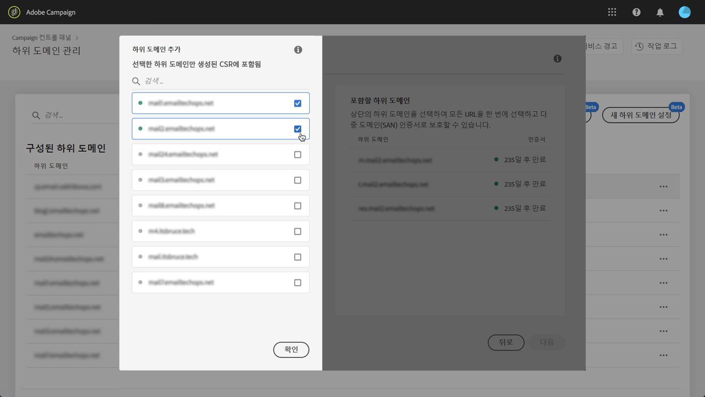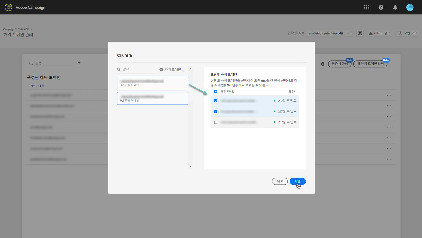 선택한 하위 도메인이 목록에 표시됩니다. 각 CSR에 포함할 하위 도메인을 선택하고 Next을 클릭합니다.